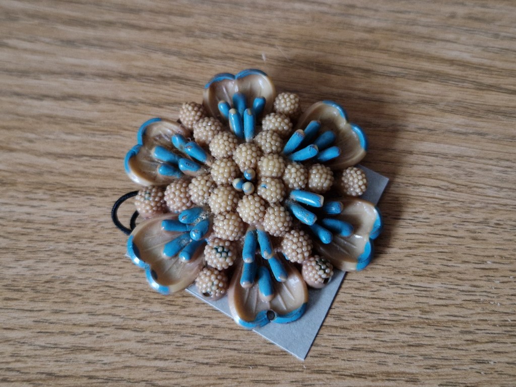 Håller oss kvar på 20/30-tal, i mitten ett klassiskt art deco-halsband i krom och galalith, resten är i bakelit. Materialen är dock blandade vilket inte var ovanligt på den här tiden, de få plastmaterial som fanns hade väldigt olika egenskaper. Det till vänster har en kedja av celluloid, det högra är blandat med trä och det nedre har småpärlor av en annan plast, troligen lucite som vid den här tiden var den enda plast (vad jag vet i alla fall) som gick att göra genomskinlig.