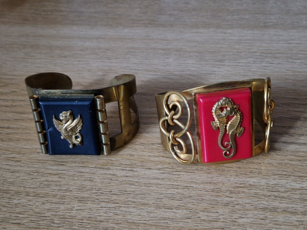 Vackra armband från 20-talet, alla i celluloid. De övre är för överarmen vilket var väldigt vanligt om du var en ”flapper-girl”. Den tidens celluloid var något skörare än den senare, att de överlevt och dessutom med stenar i behåll är egentligen rätt otroligt – de är ju närmare 100 år gamla!