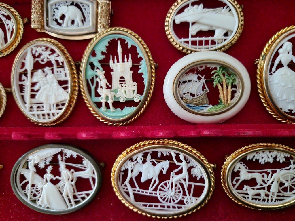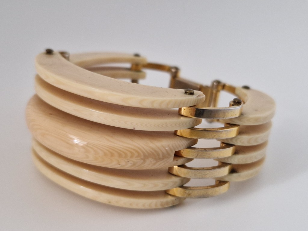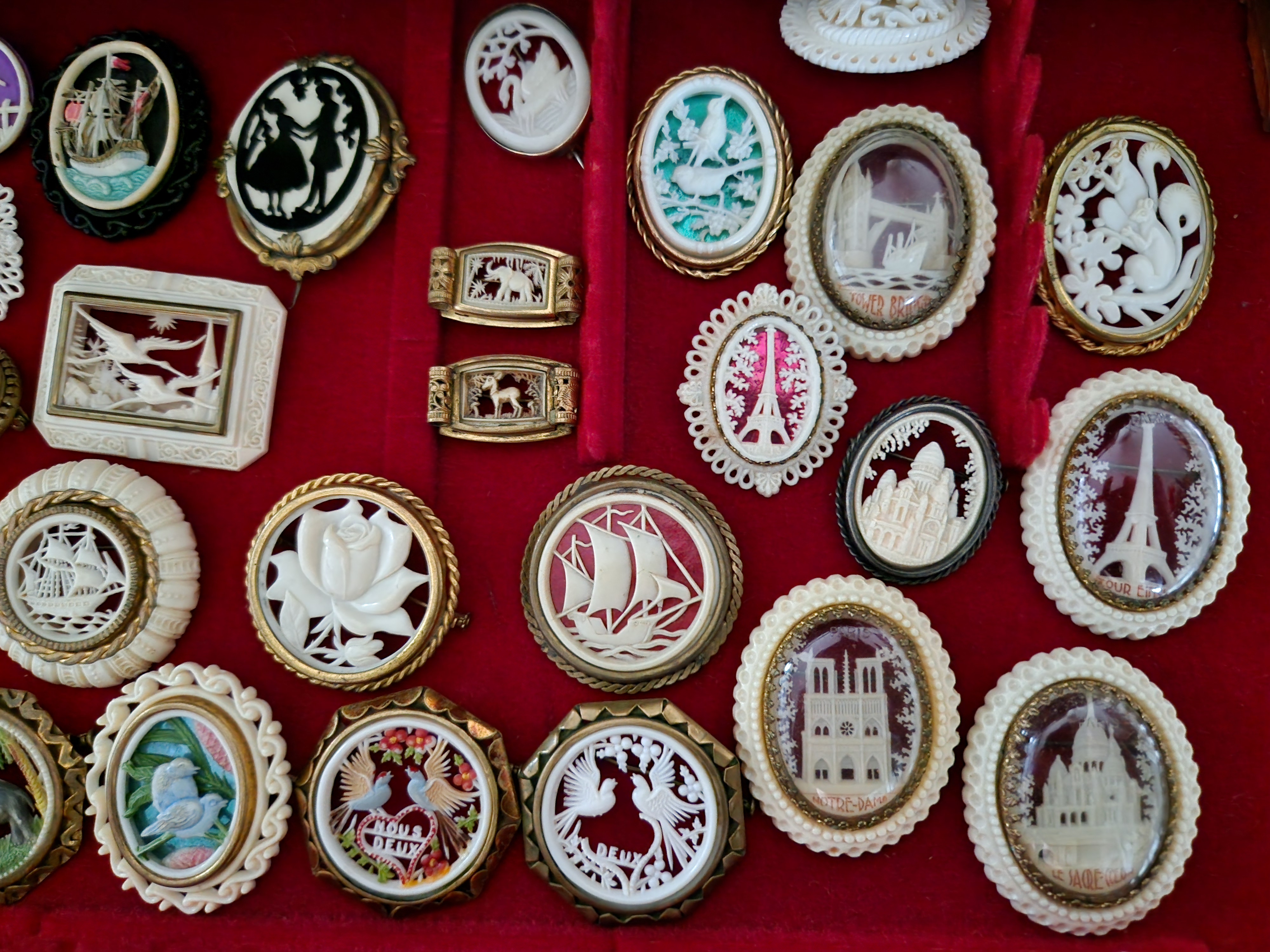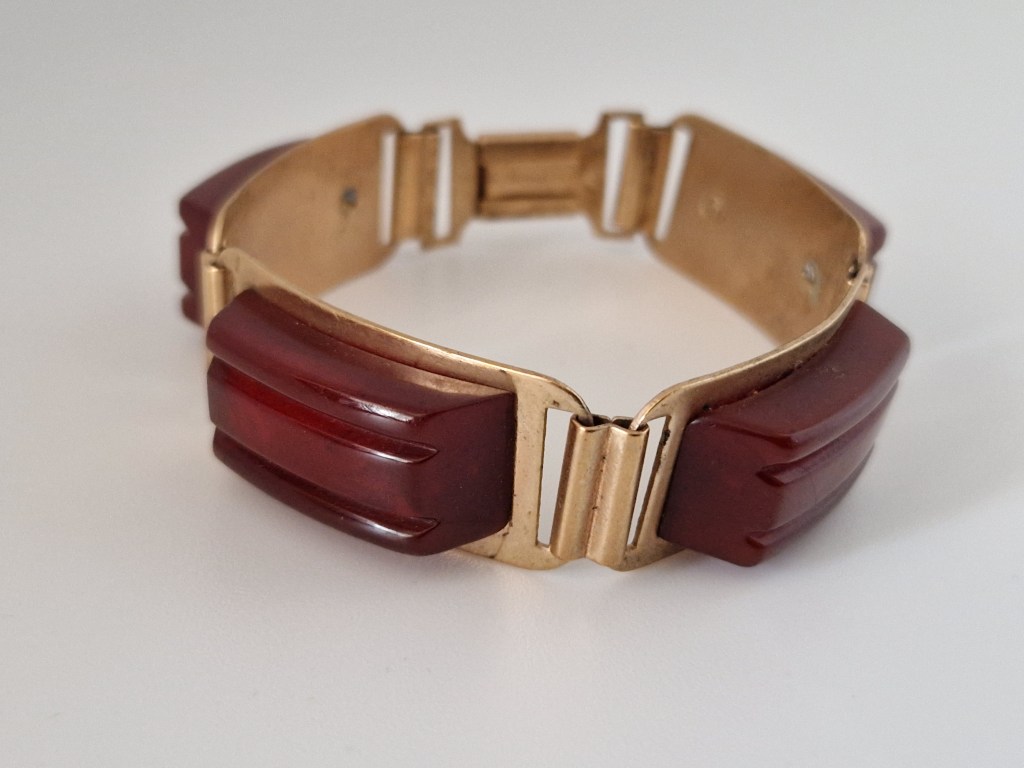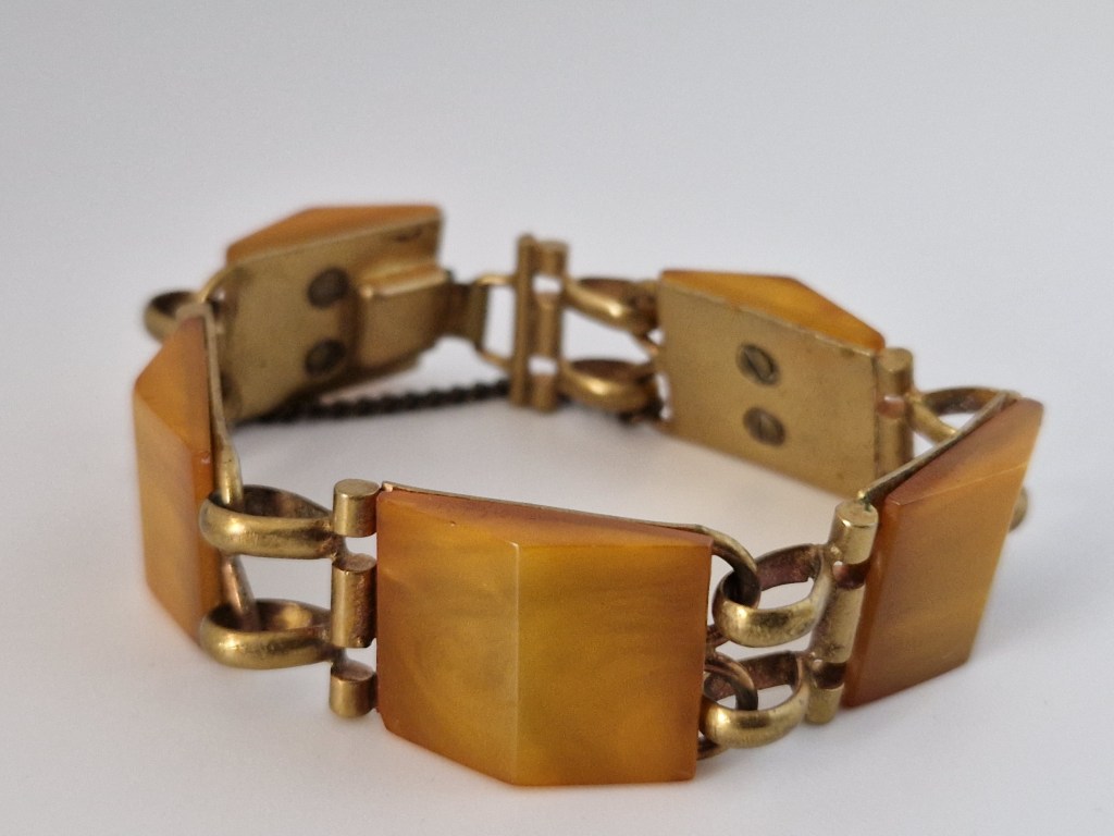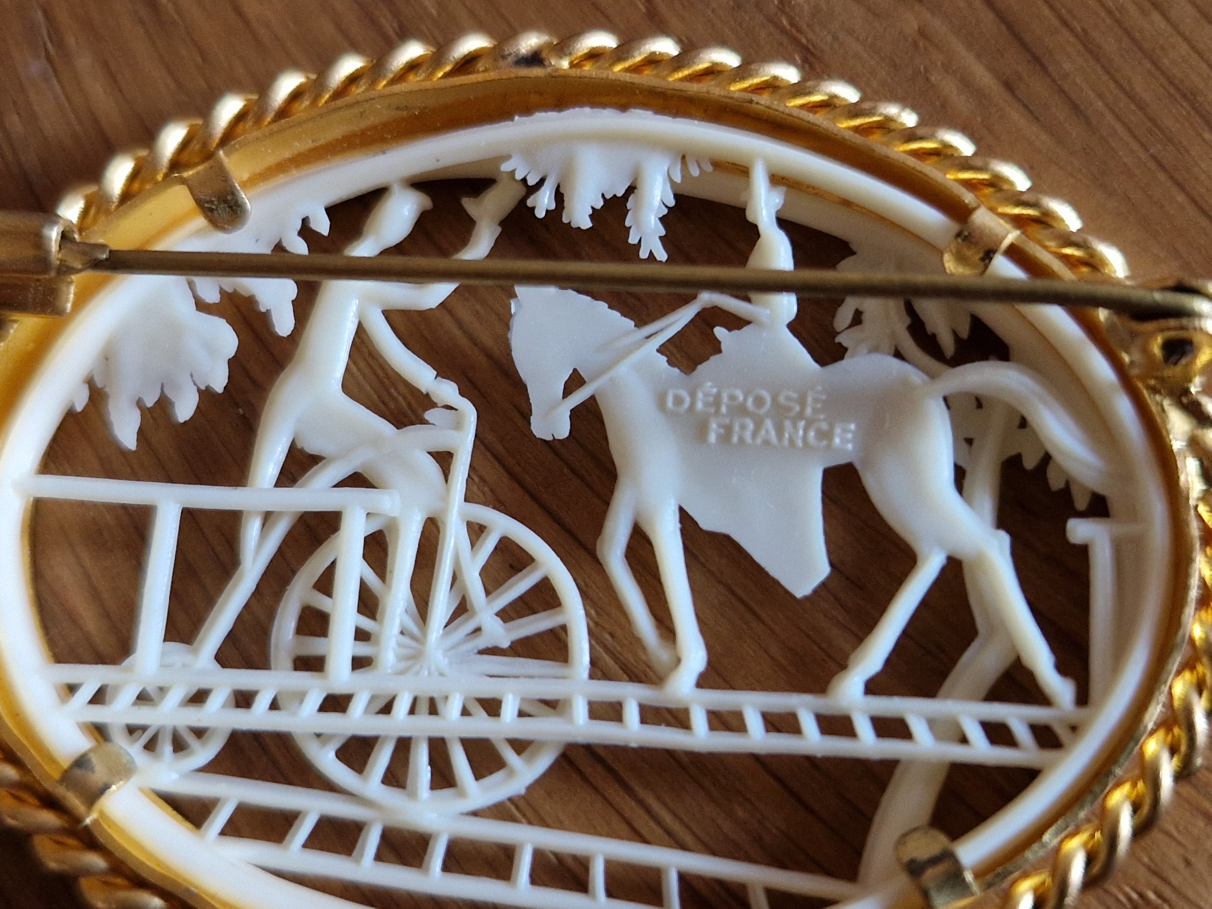 Många av dem kommer från Frankrike, i alla fall den här typen här ovan. De flesta är märkta med Depose France men Depose är inte tillverkaren (som många tror) utan det betyder ungefär ”patent för något som är handtillverkat i Frankrike”. Tillverkare av dessa var ett företag som hette Maloupa i Paris. Förutom märkningen har alla dessa broscher trombonlås som är väldigt vanligt vid den här tiden när smycket kommer från Frankrike.