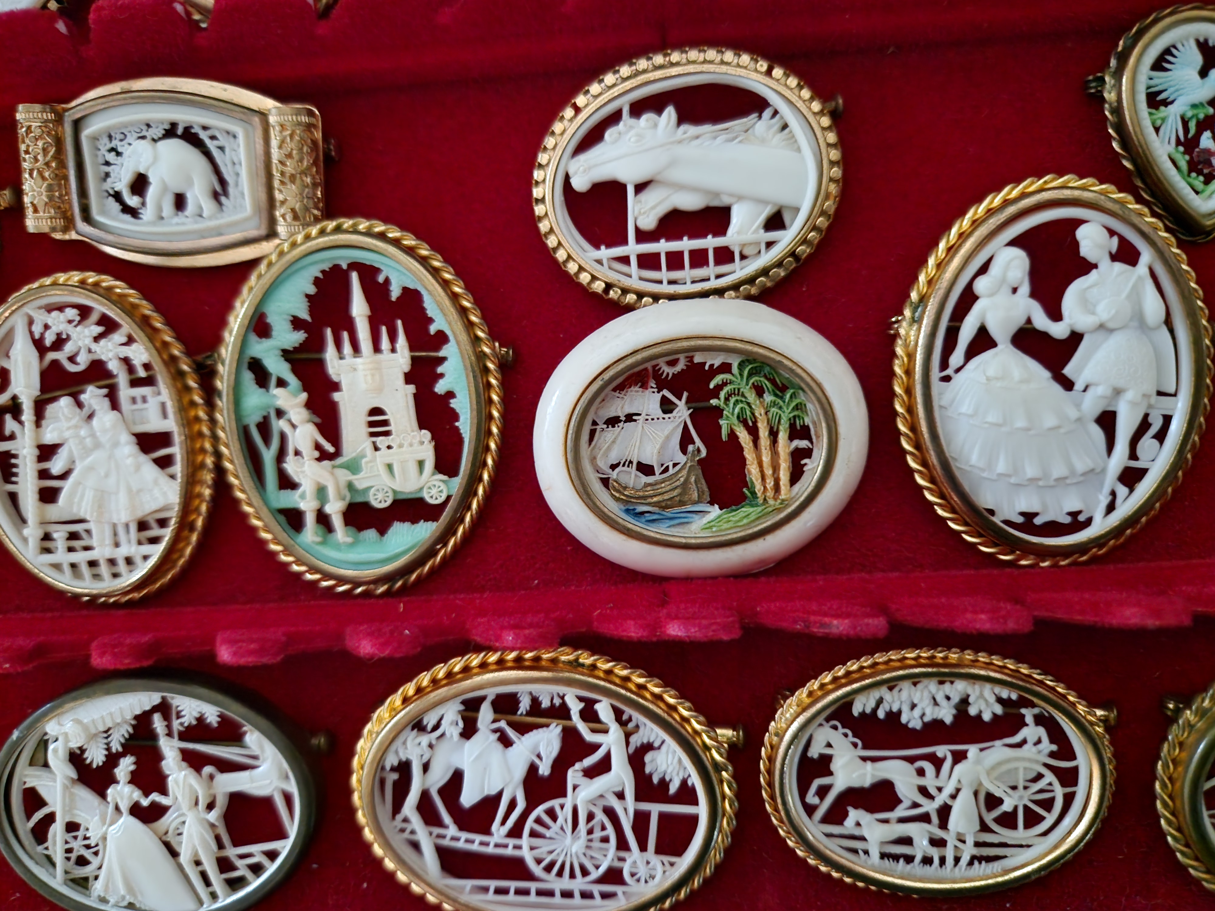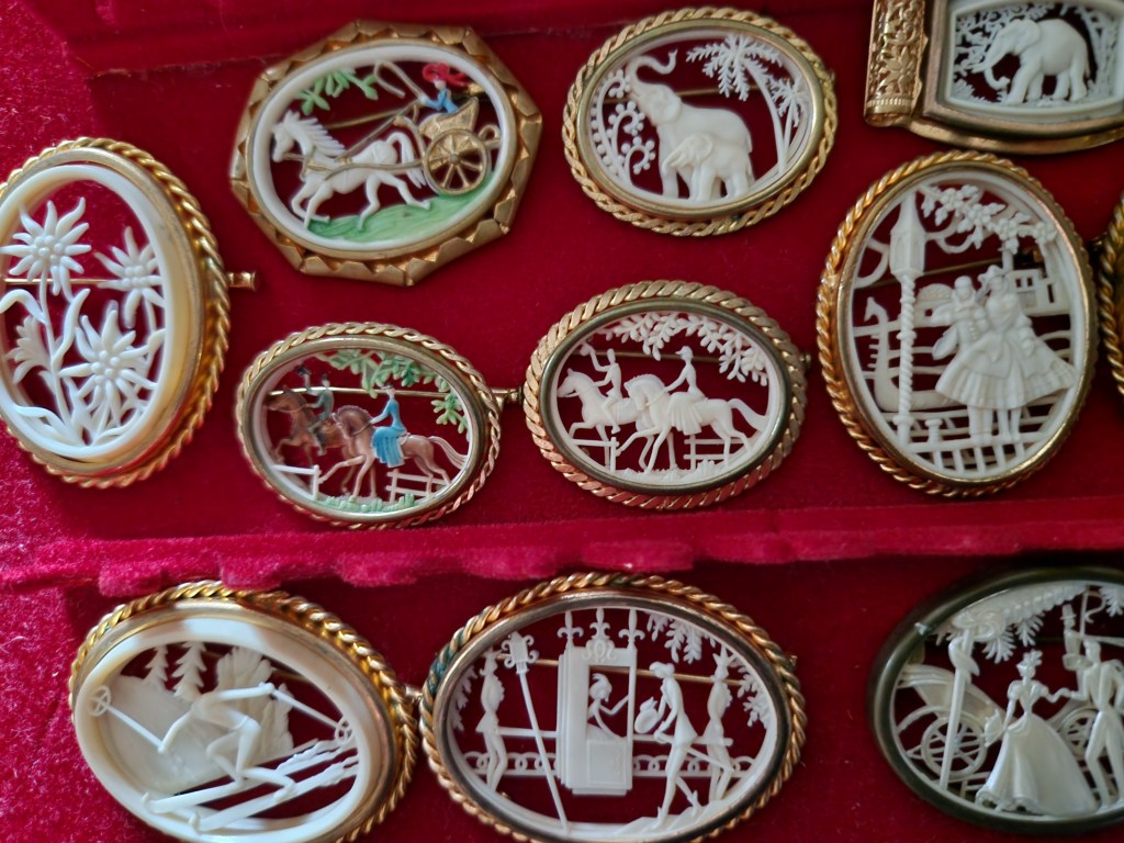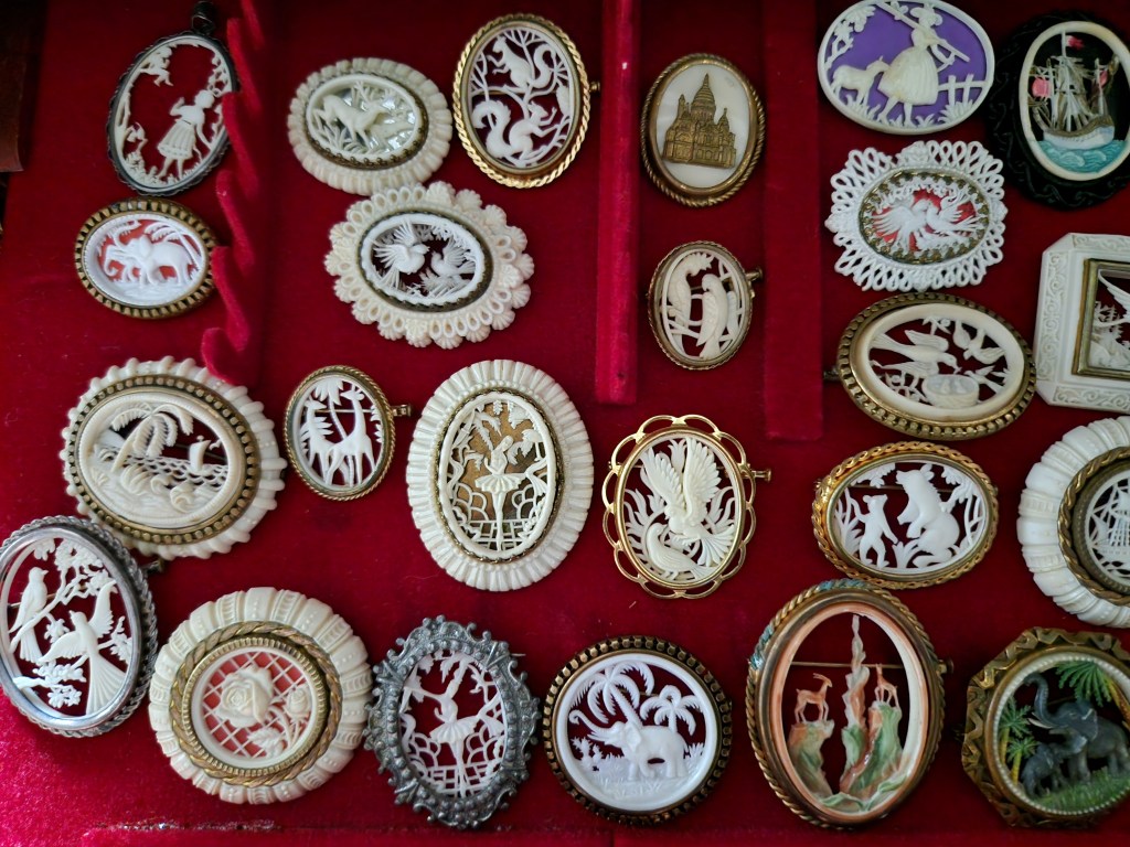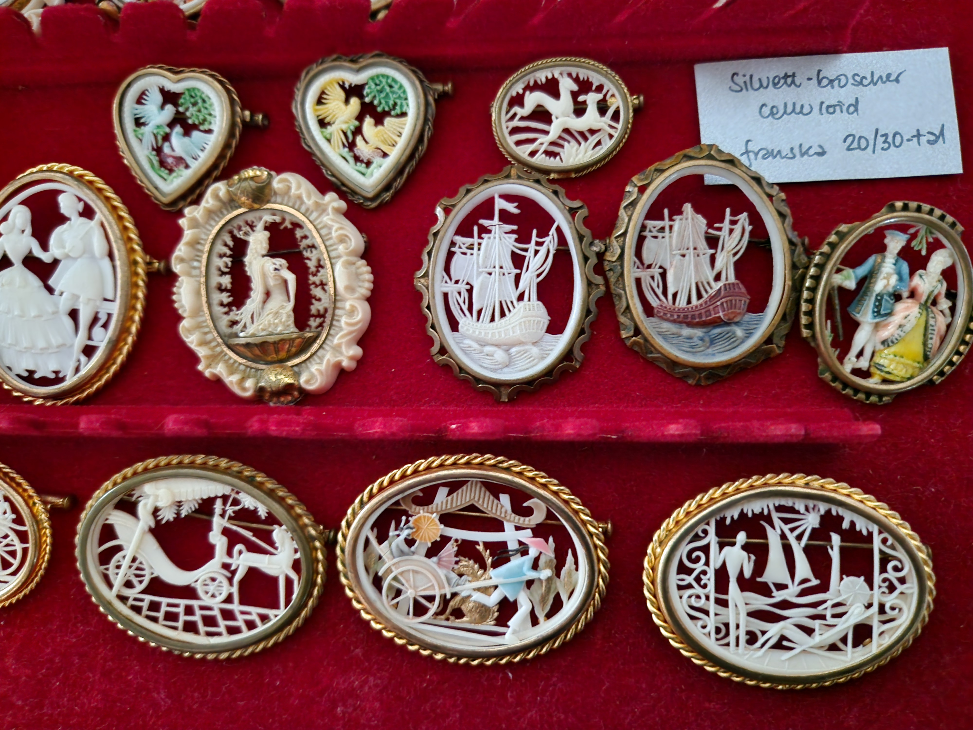 Nu har jag fått fram min samling av siluettbroscher i celluloid, dessutom köpt ytterligare en. Siluettbroscherna är alla i celluloid och från 20- och 30-talet. Otroligt när man tänker på att dessa broscher är tillverkade i en relativt skör plast och har massor av små detaljer har överlevt i bortåt 100 år!