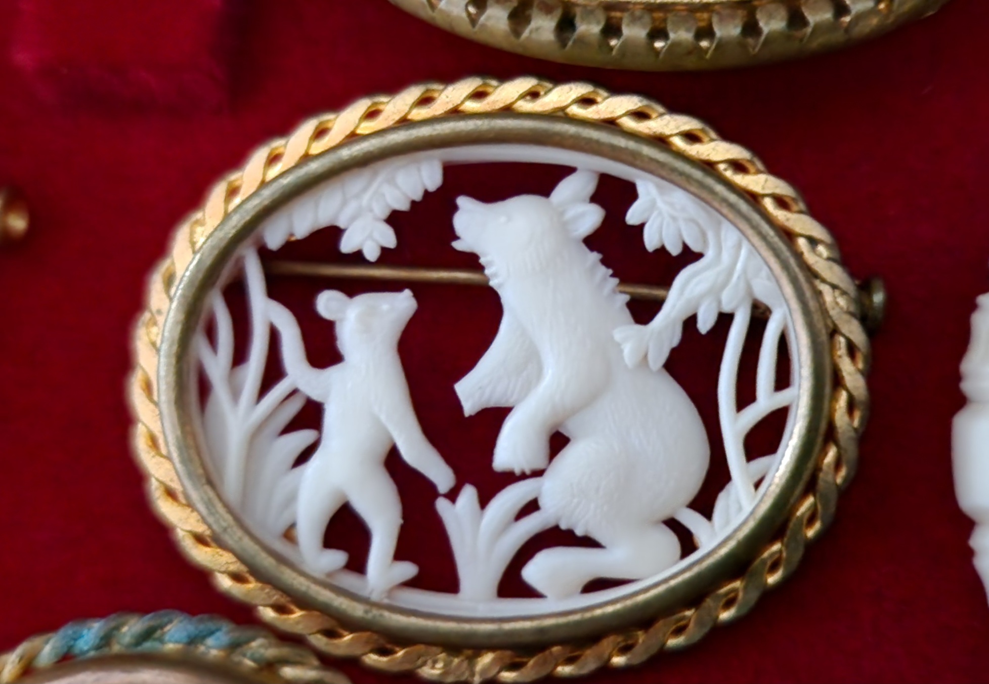 Man behöver både syna dem noga och kanske försöka hitta en bild på hur den ska se ut annars kan det ibland vara väldigt svårt att se om det saknas någon liten detalj. Tyvärr säljs de ofta på tex Tradera utan kommentarer om skador som gör att det ibland kan vara väldigt svårt att se om broschen är komplett eller inte, det handlar ju både om att veta vad man köper men också en prisfråga. Jag tror att de allra flesta av mina broscher är kompletta men dessa två är det inte. Den vänstra är ju lätt att se med blotta ögat men den högra är inte lika lätt att upptäcka men den större björnen saknar en liten del av sin tass.