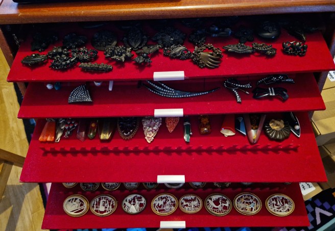 Nu är alla siluettbroscher, clips-broscher, hattbroscher och sorgesmycken sorterade. Så är också skåp 1 & 2 som innehåller perioden från sent 1800-tal fram till och med 1940-talet.