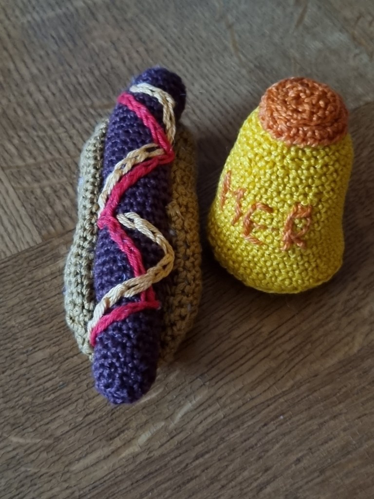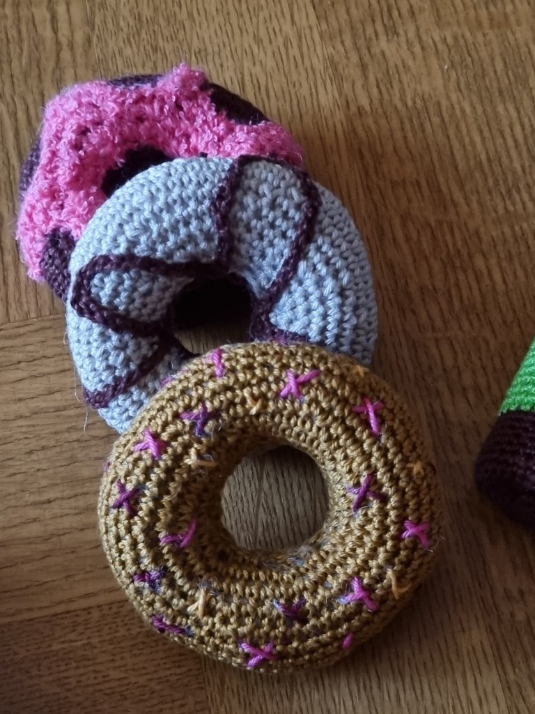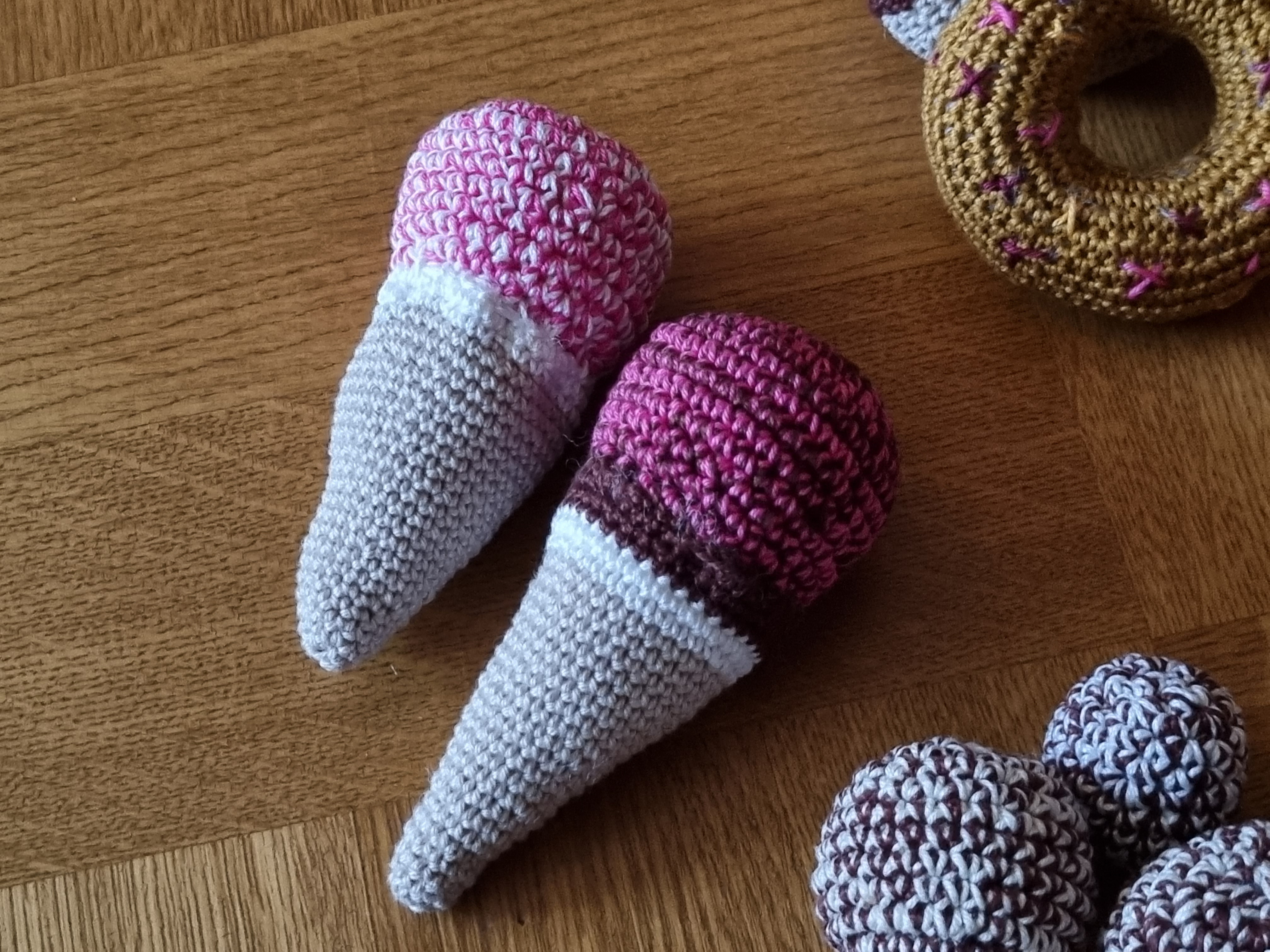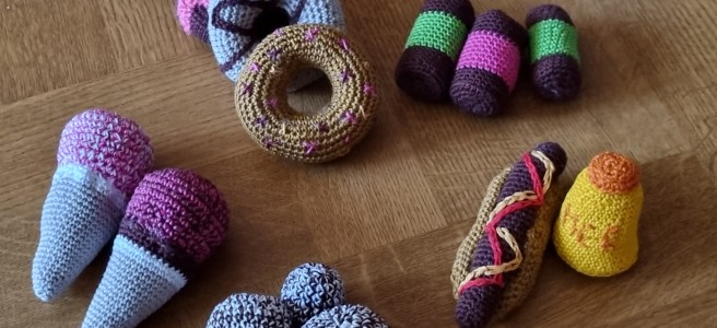 Så vad göra? Jo, jag har en liten tjej i min omgivning som gillar att leka affär, bjuda på fika och sånt så jag gav mig på något som jag i ärlighetens namn alltid tyckt var lite fånigt – jag har virkat kakor, glass och lite mat!