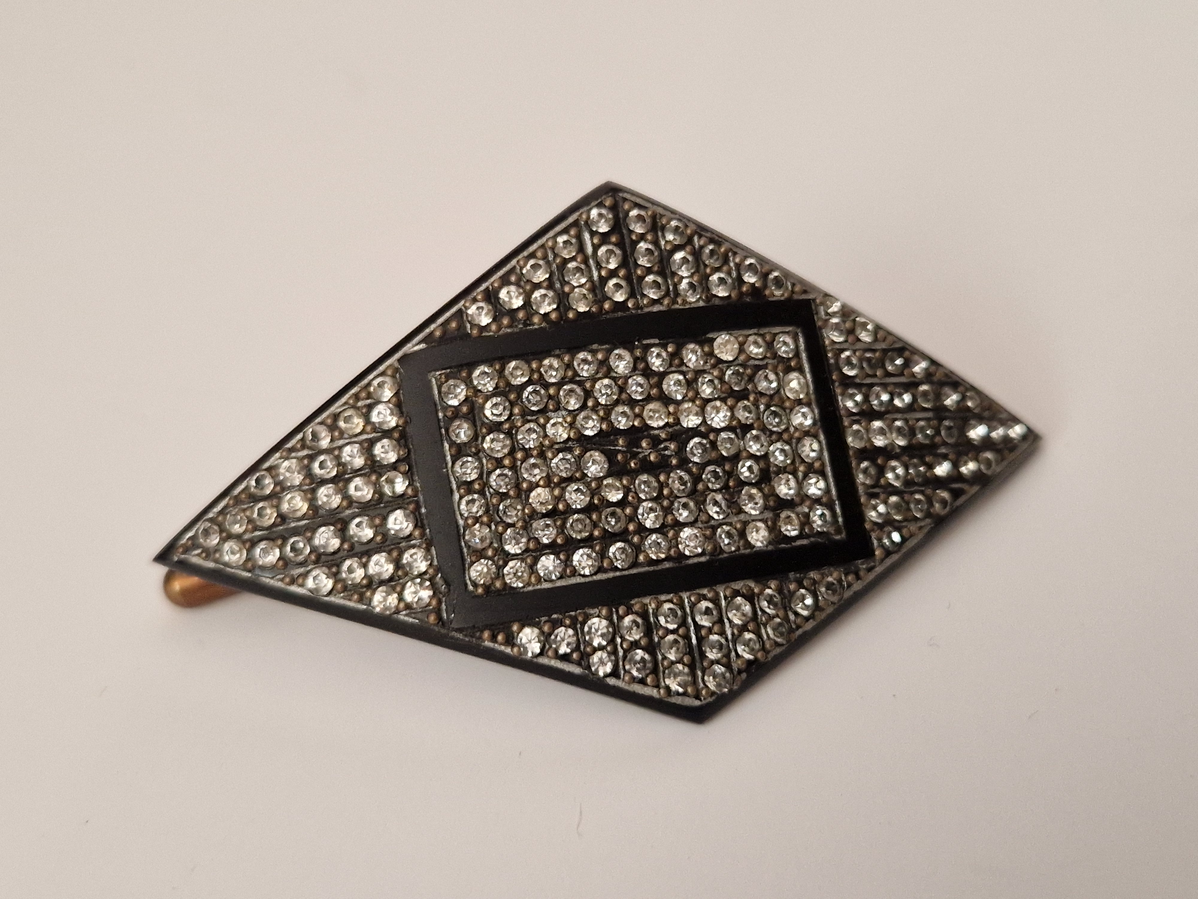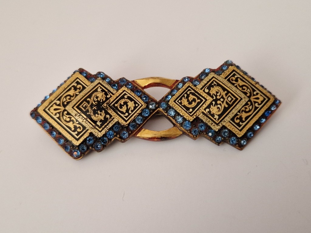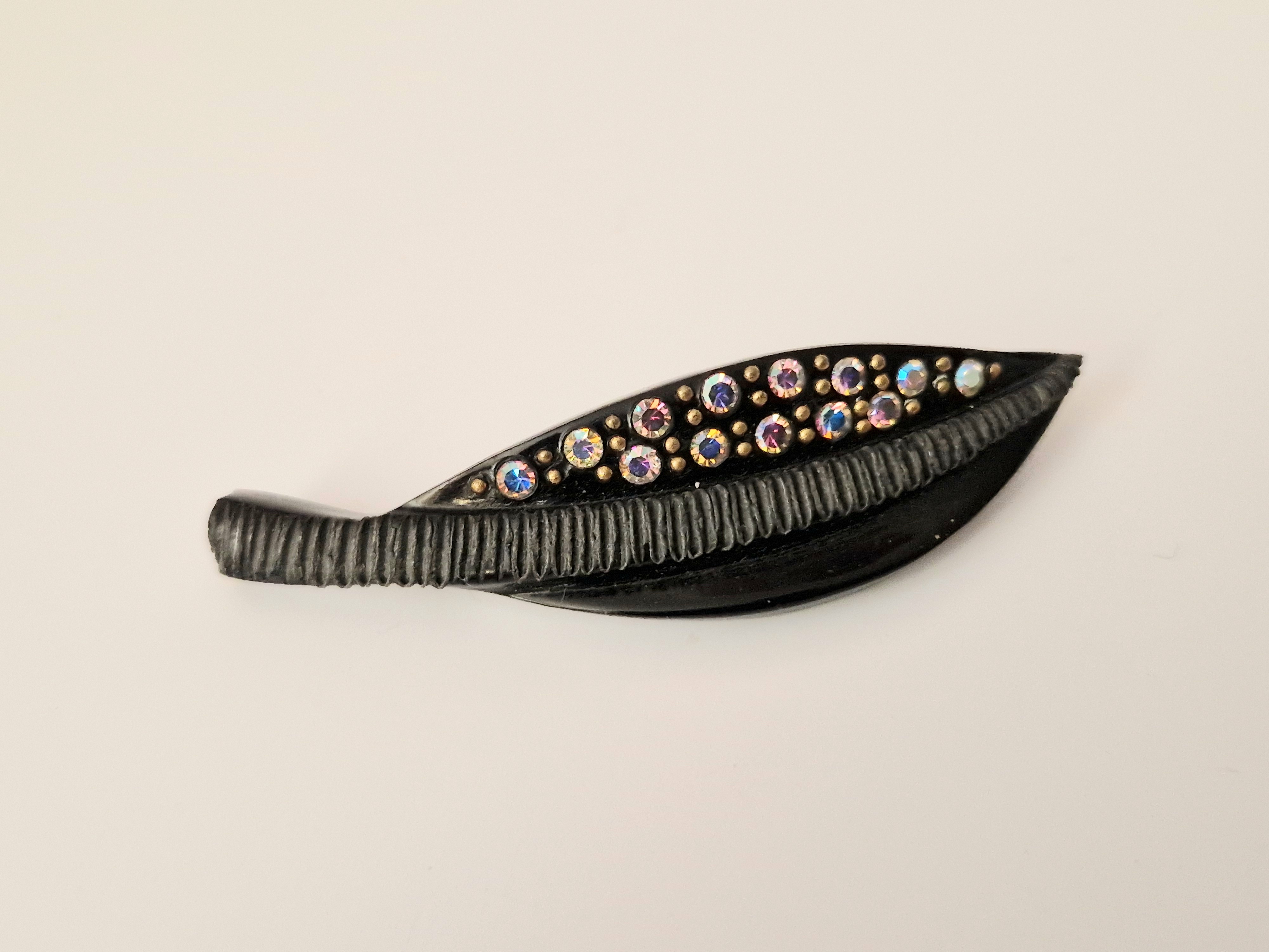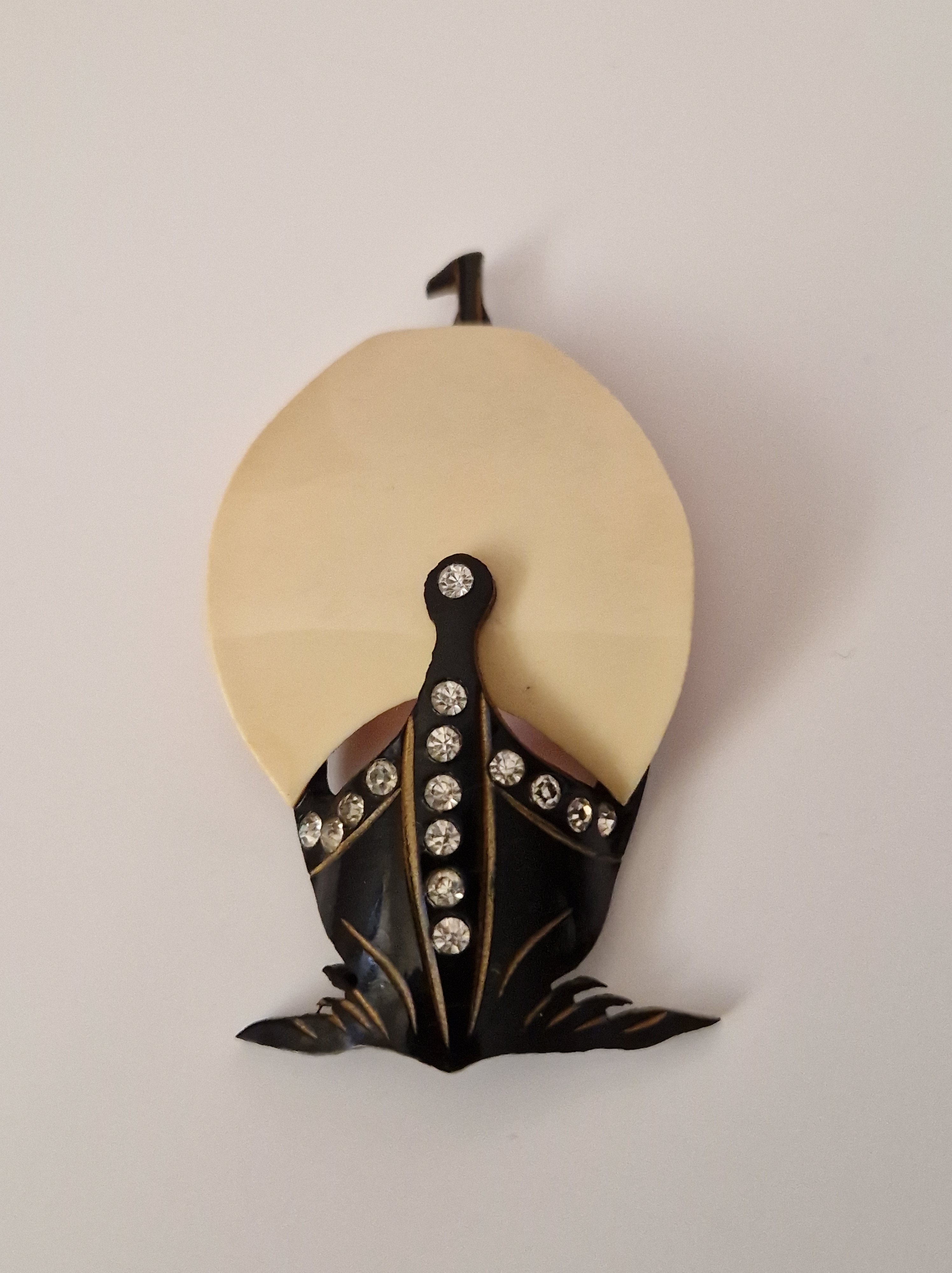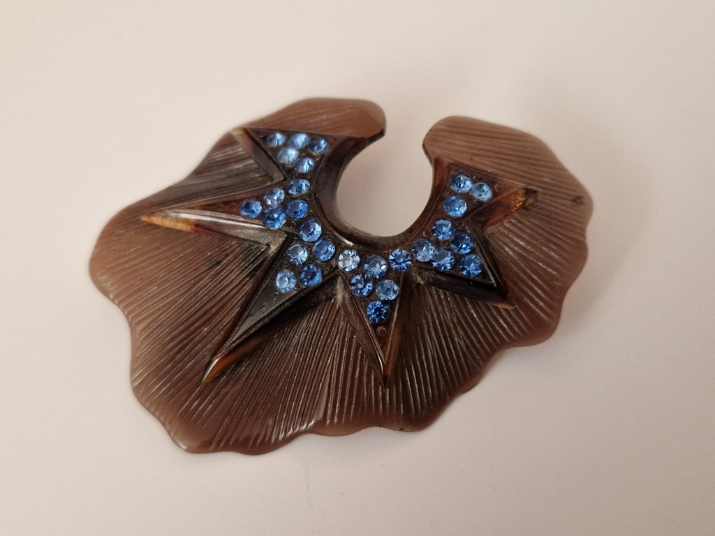 Först två helt ljuvliga broscher i bakelit med metall och stenar. De här känns verkligen som från en annan tid när även bijouterier gjordes med största hantverksskicklighet. Ingen vet egentligen ursprung men troligen Tjeckoslovakien eller någonstans i det området, där tillverkades många otroligt vackra i smycken med metall och stenar (glas) under den här perioden.