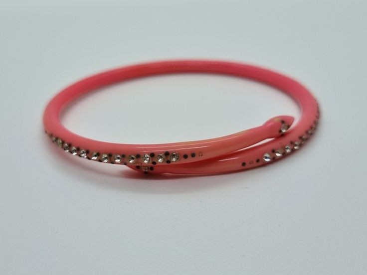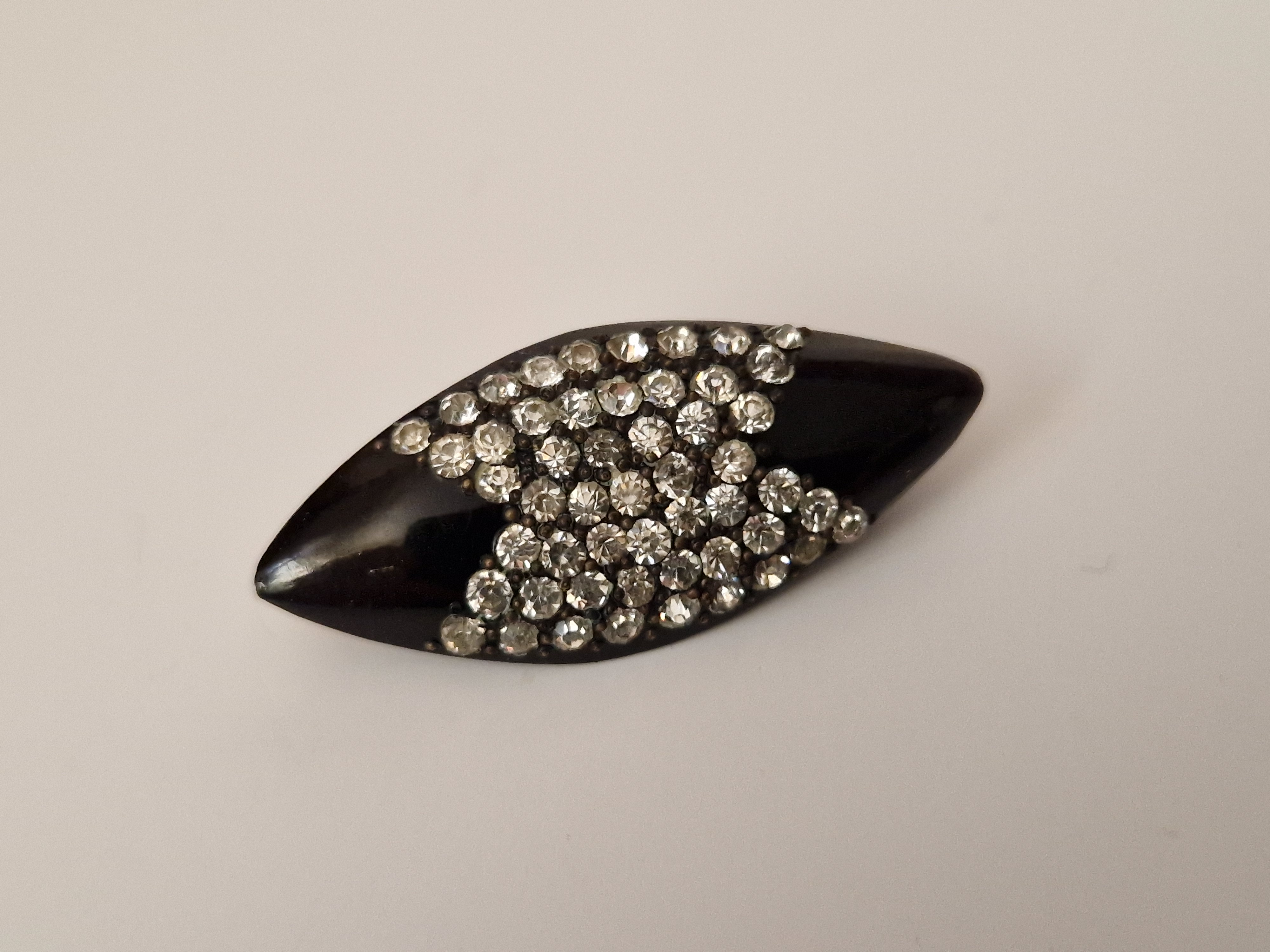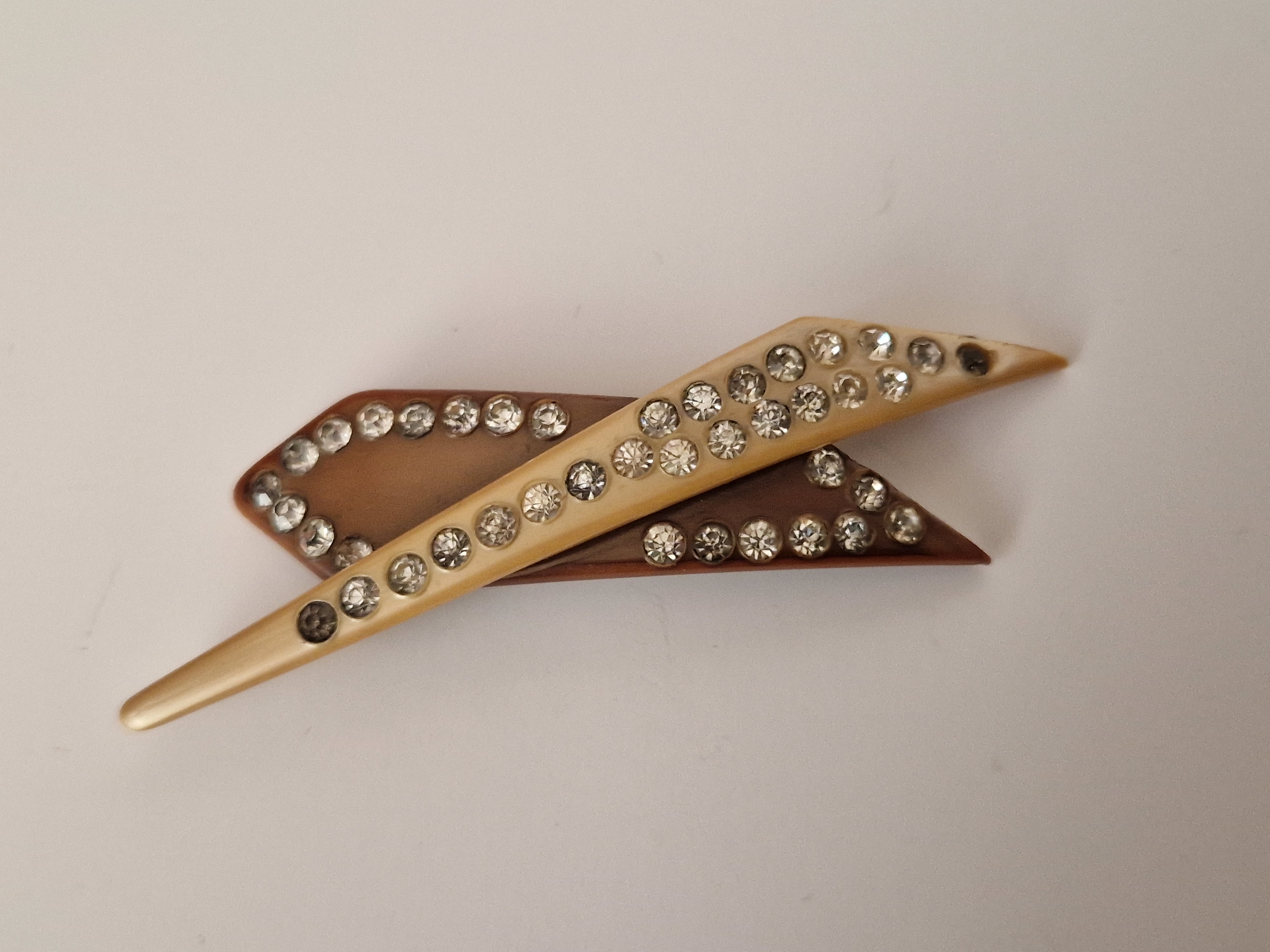 Två relativt tidiga plastsmycken från 20-talet i celluloid, det vänstra armbandet är ett ormarmband med strass för att bära på överarmen och till höger är en rätt vanlig variant på brosch från tidigt 20-tal.