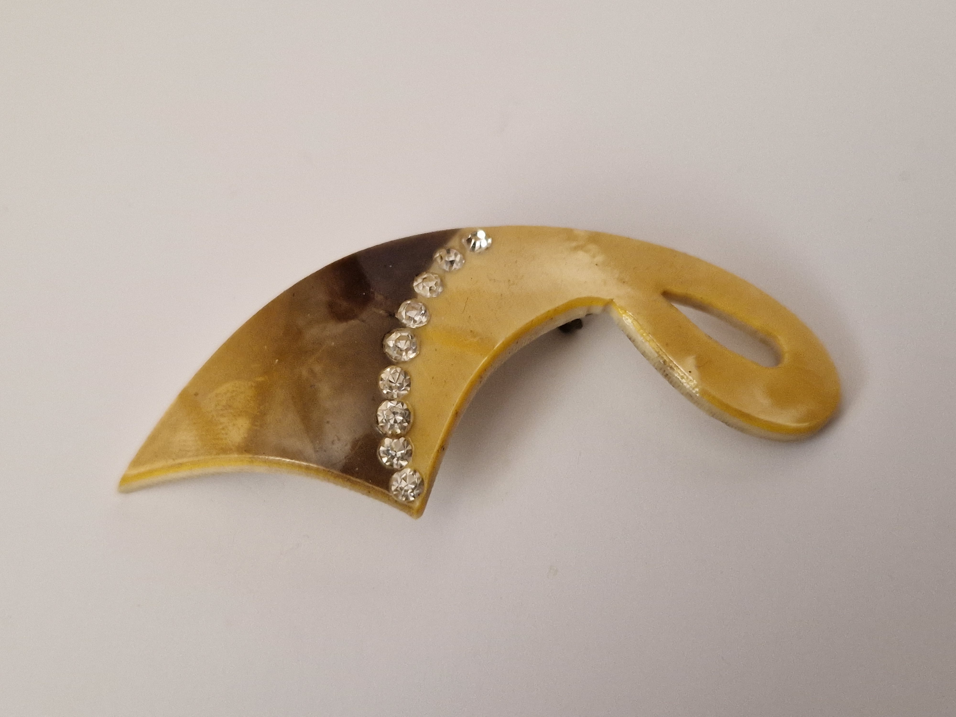 Det här var en form på brosch som var vanlig under art deco-perioden, inte bara i plast utan över huvud taget. När det gäller bakelit var de antingen gjutna i form som skapade mönstret men ofta ”snidade” som den gula här ovan.