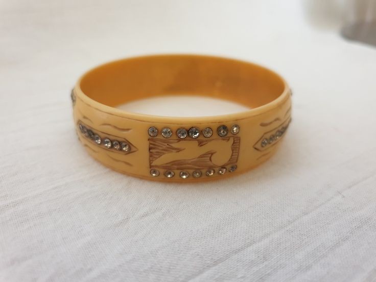 Så till sist, armband i celluloid, är dock osäker på materialet i den längst upp till vänster, från 30- och 40-talet. Det som är lite lurigt är det med blå blommor till vänster i andra raden, det här är i celluloid men samma typ av blommor gjordes också ofta i ben. Det gäller även broscher och örhängen som man också hittar i detta mönster. Till sist bjuder jag på ett underbart gult armband som är som gjort för våren och påsken .
