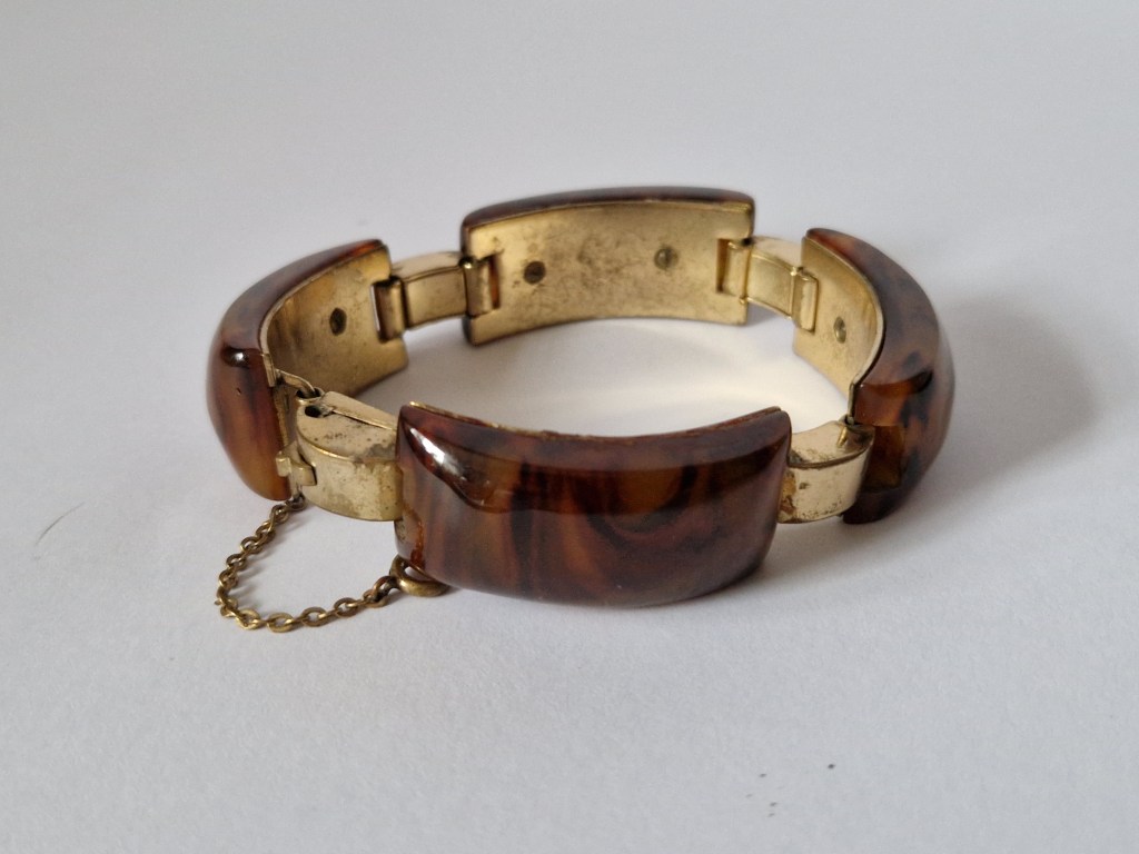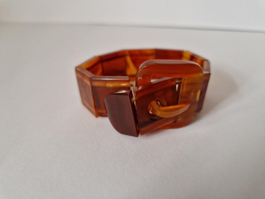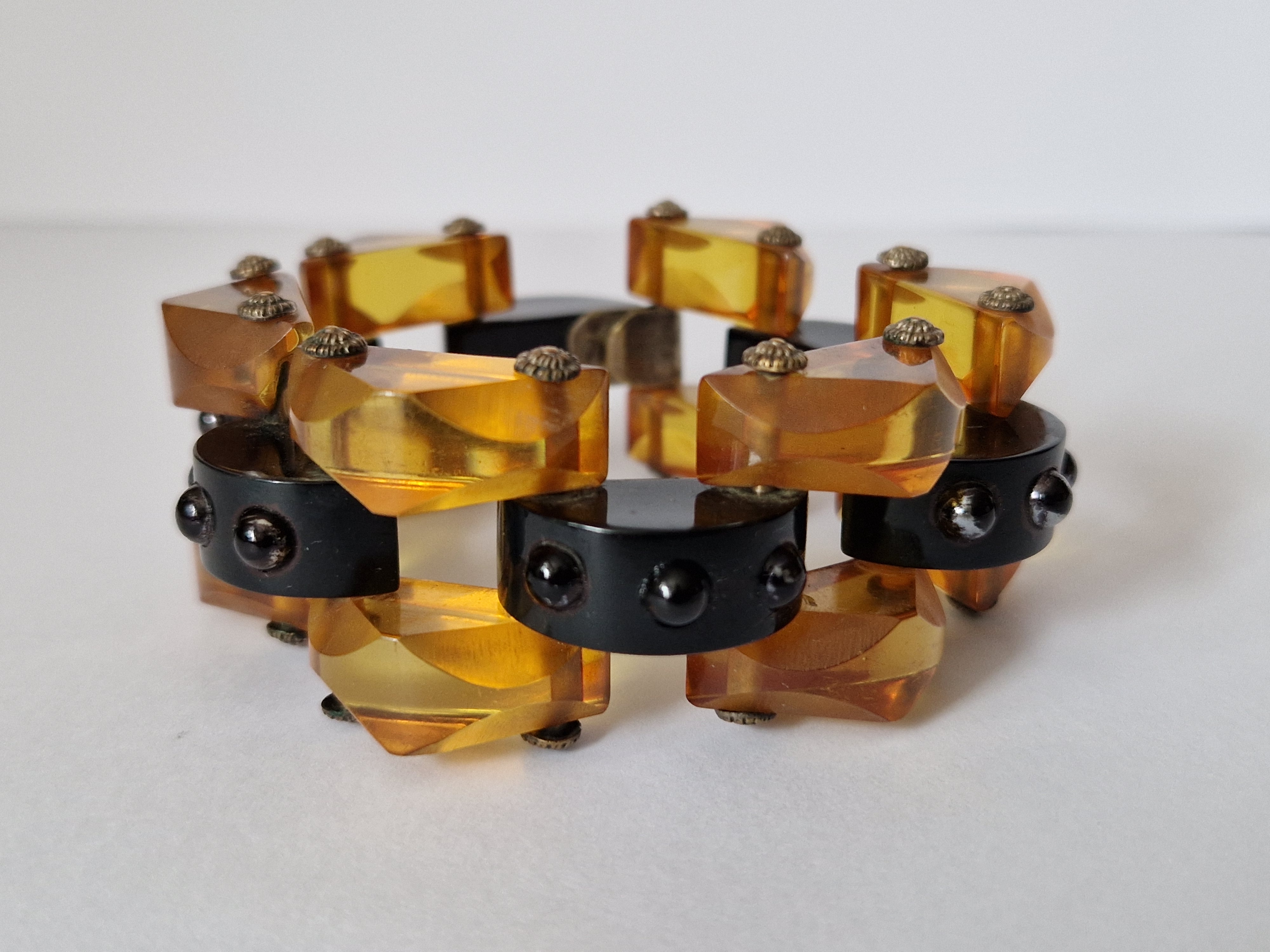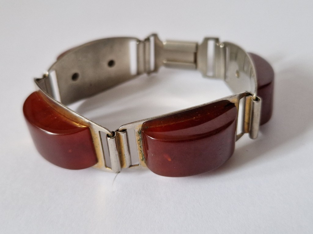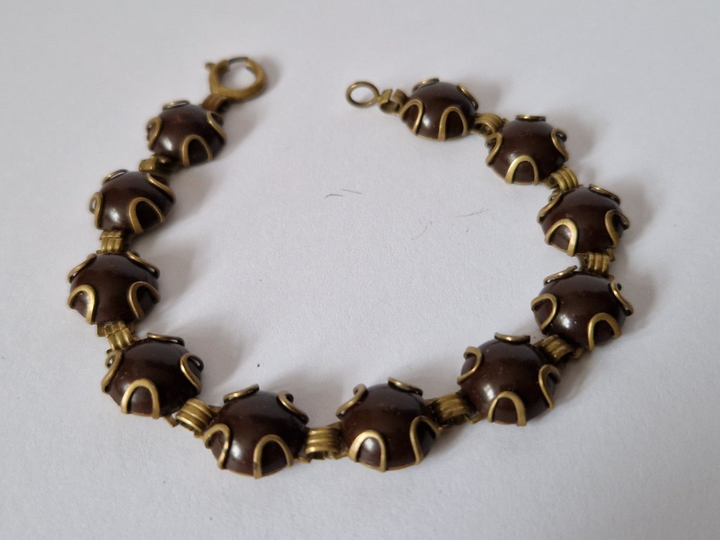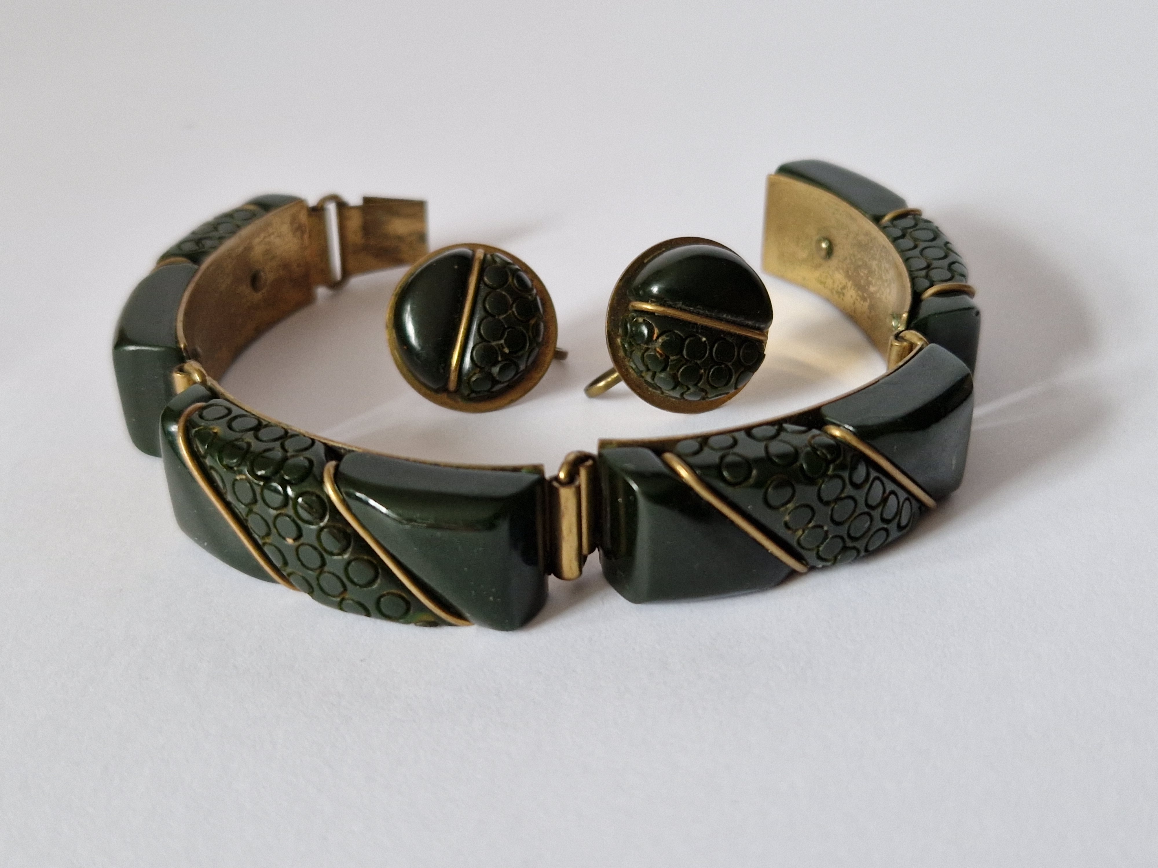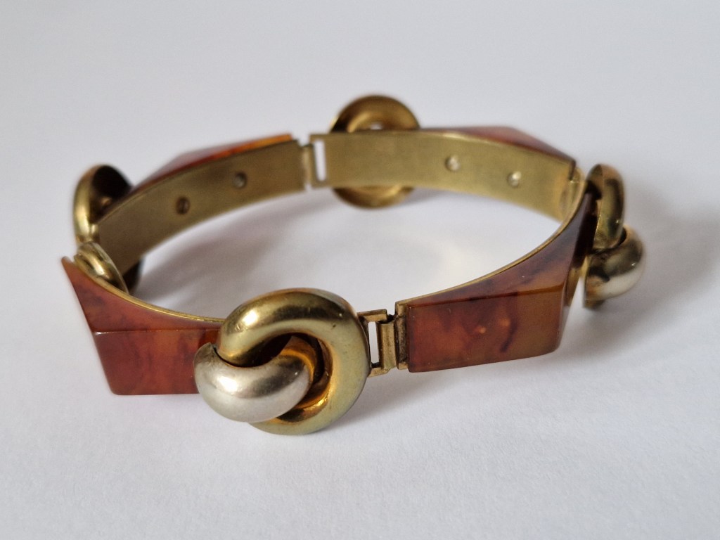 Smycken är tillverkade i mässing och galalith, en bakelit-liknande plast gjord på mjölk (!). Detta armband ingår i min samling. Har även två broscher med ”rätt” märkning.