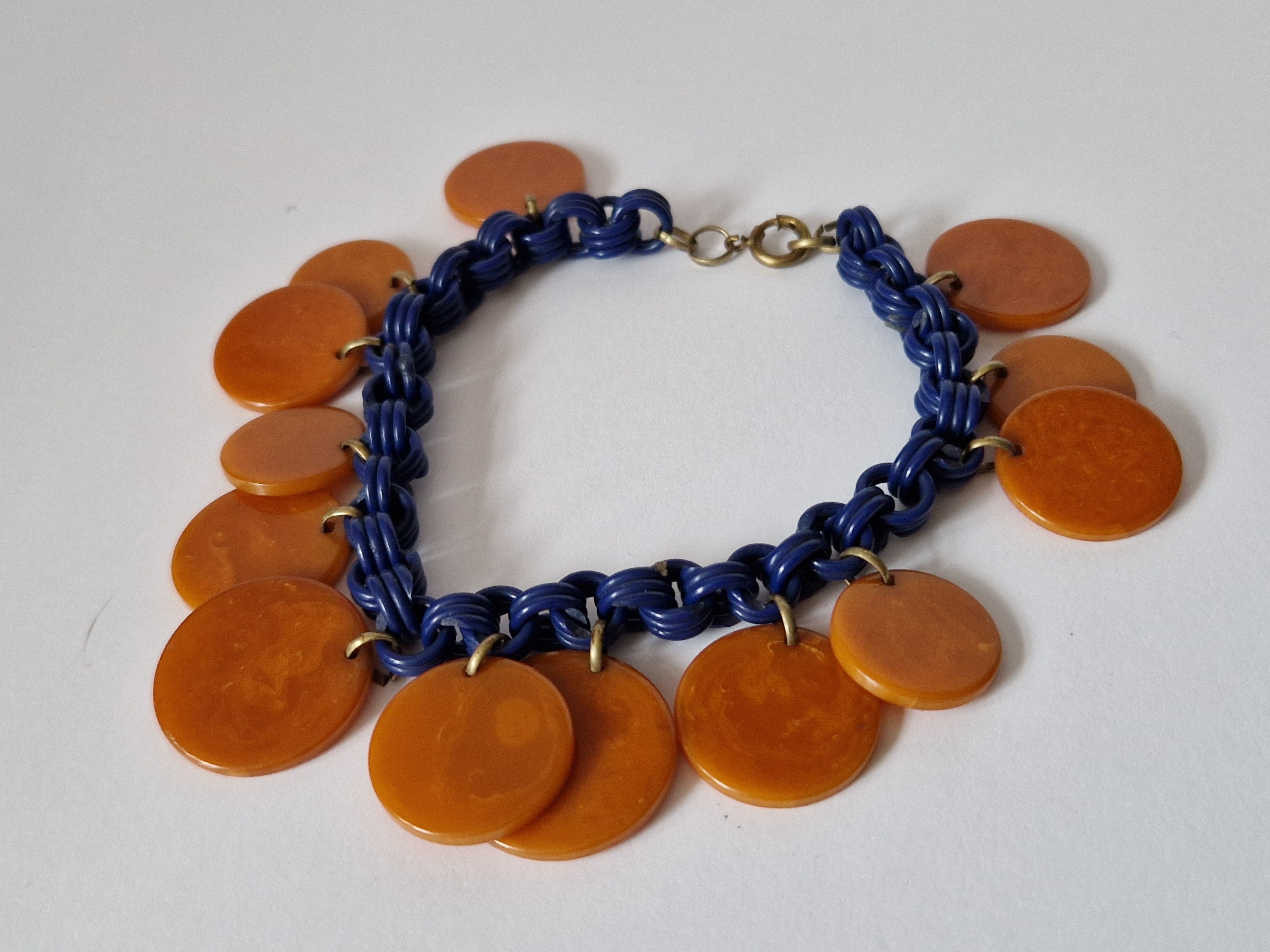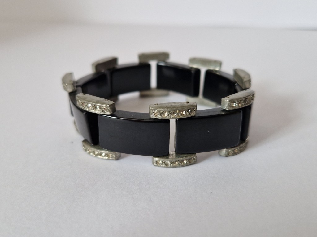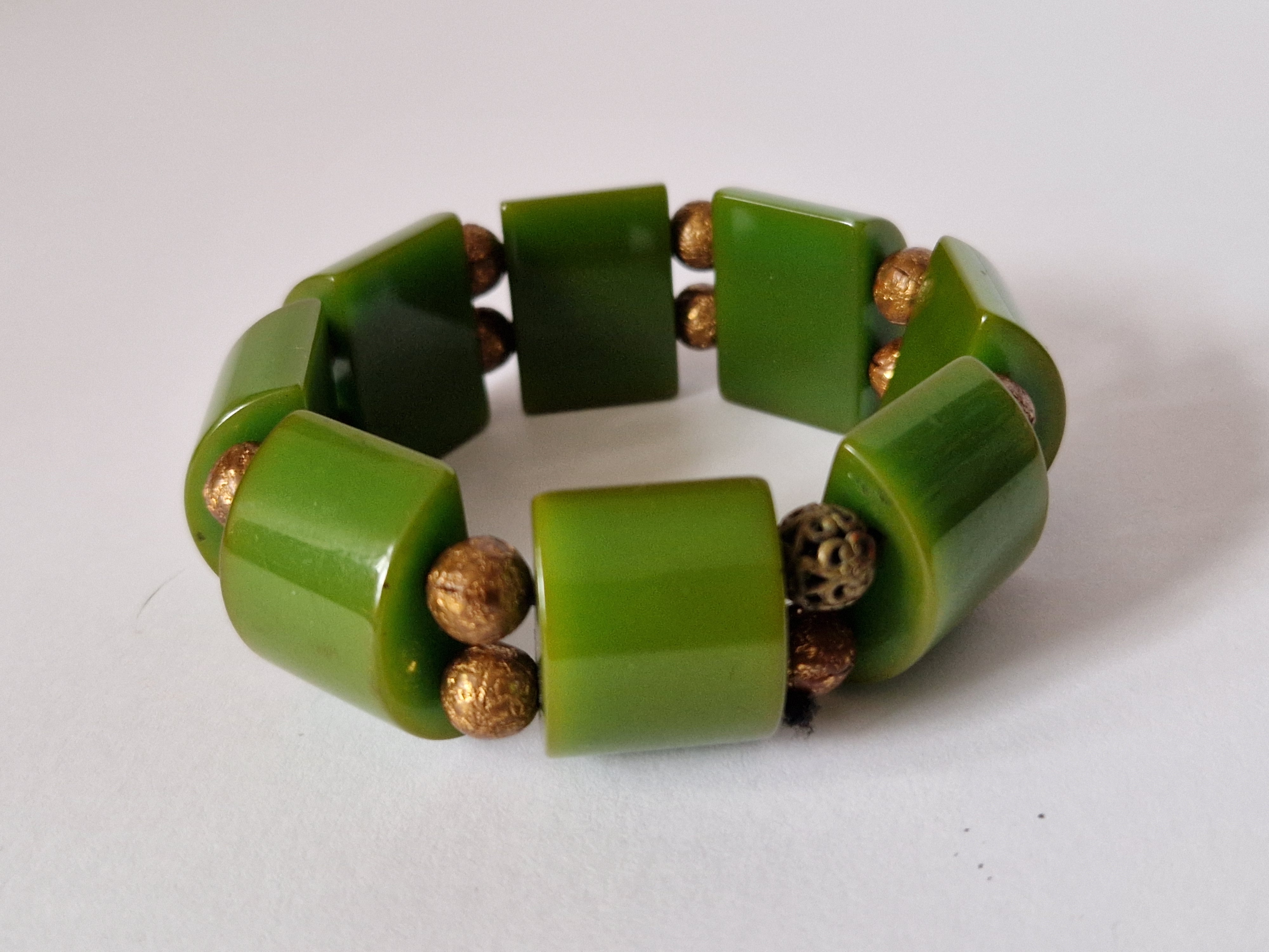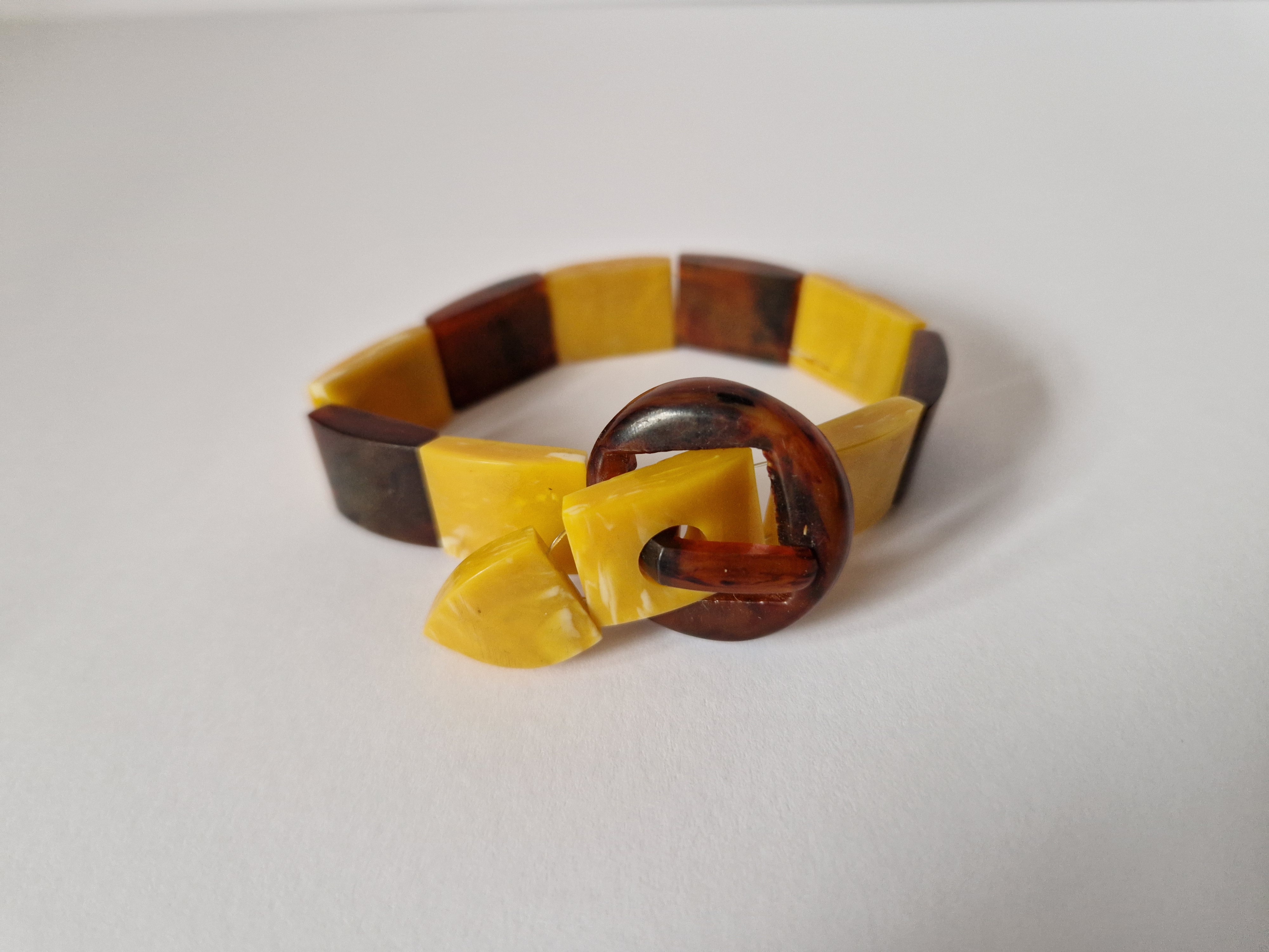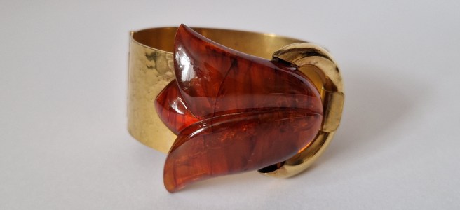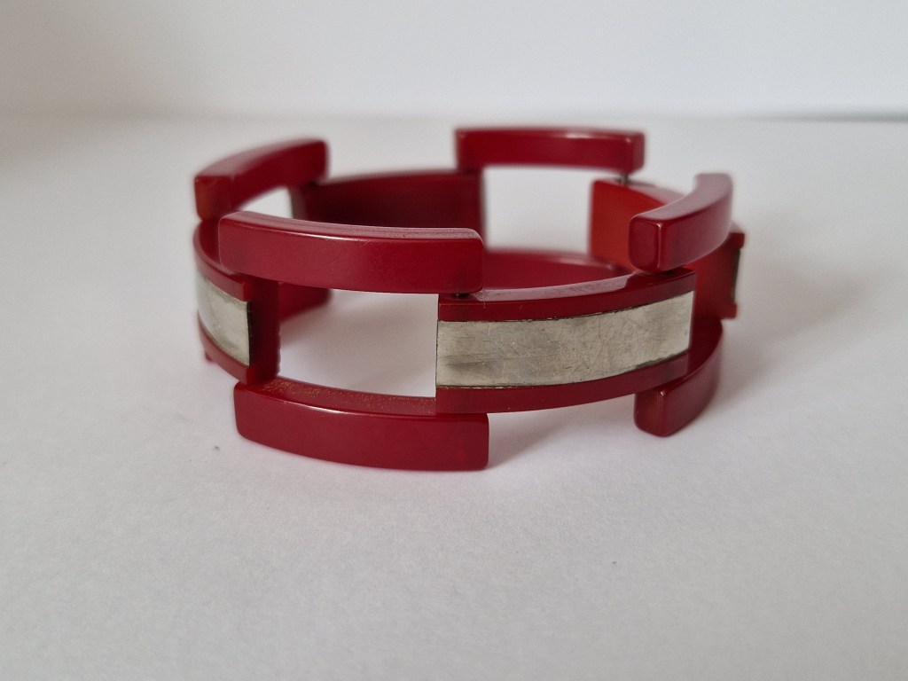 Smycken är tillverkade i mässing och galalith, en bakelit-liknande plast gjord på mjölk (!). Detta armband ingår i min samling. Har även två broscher med ”rätt” märkning.