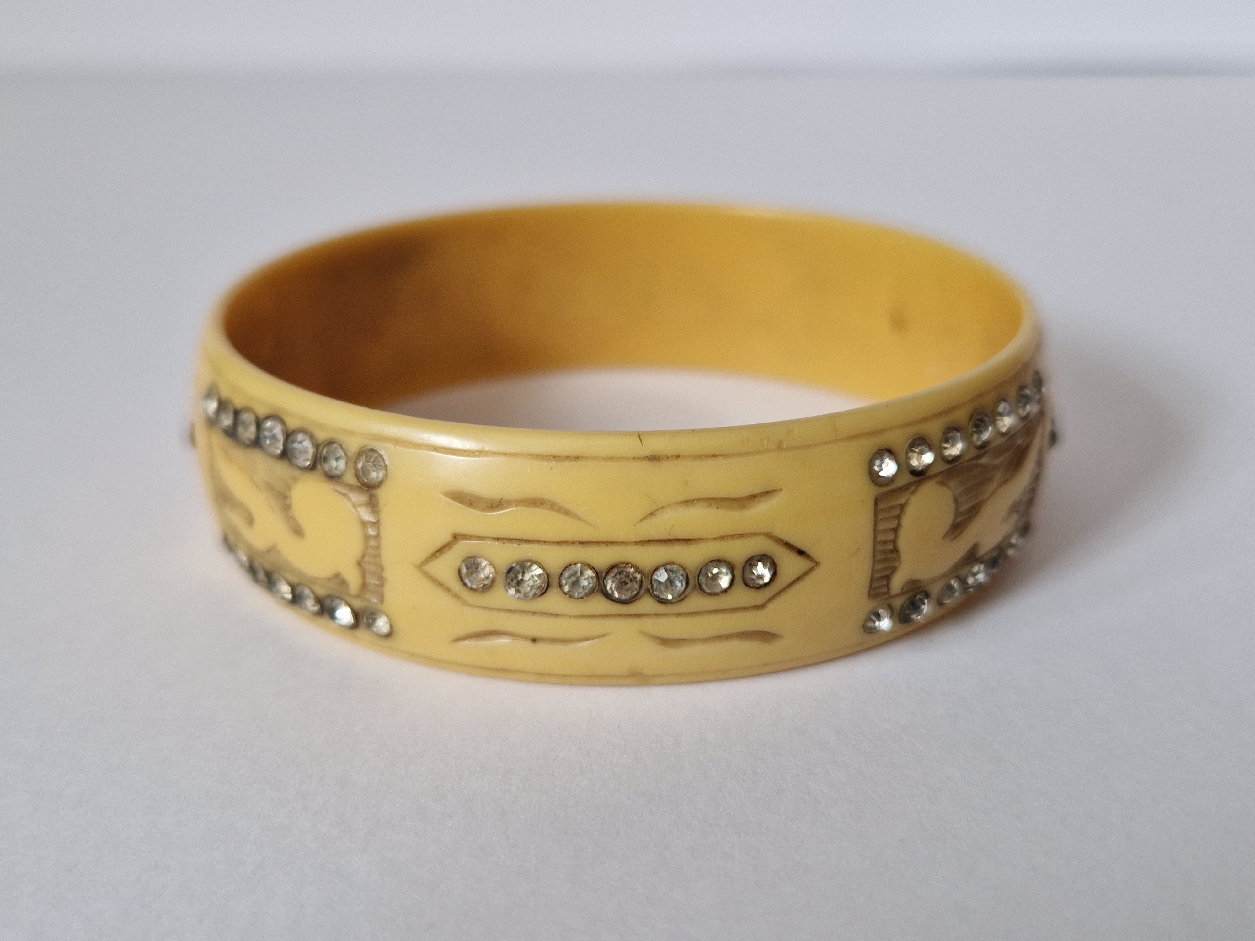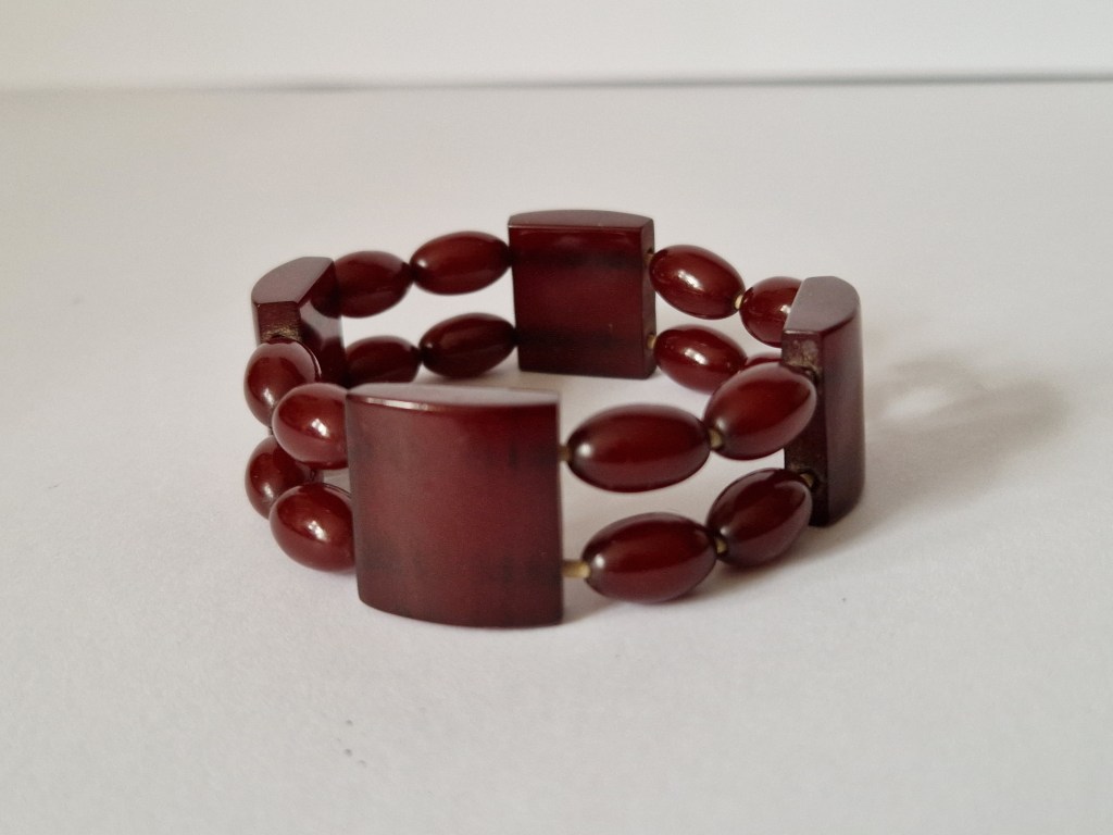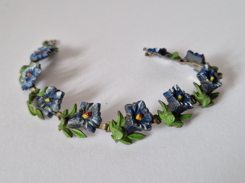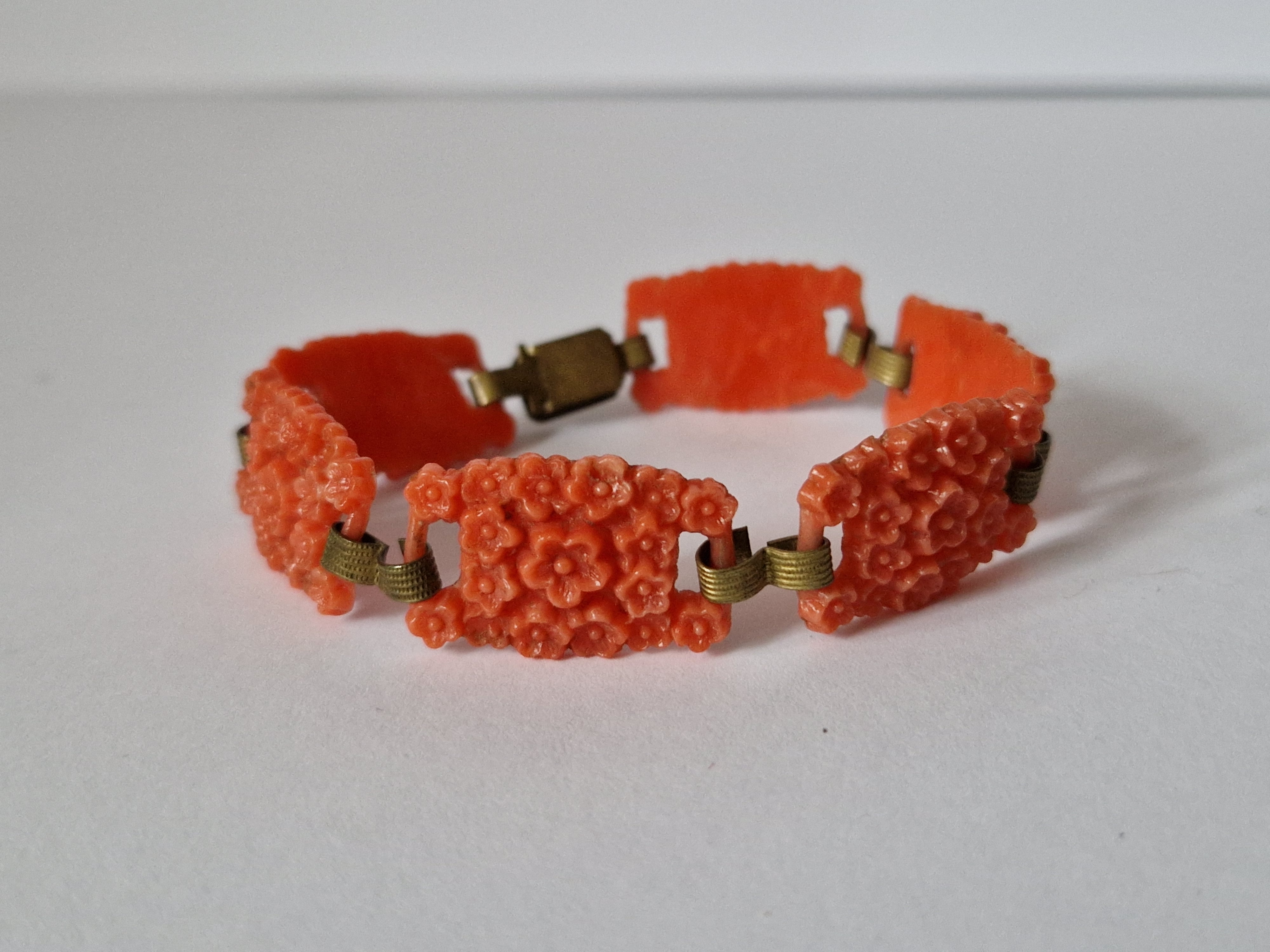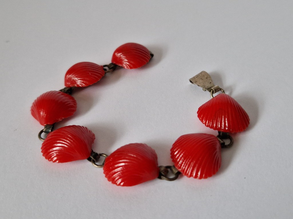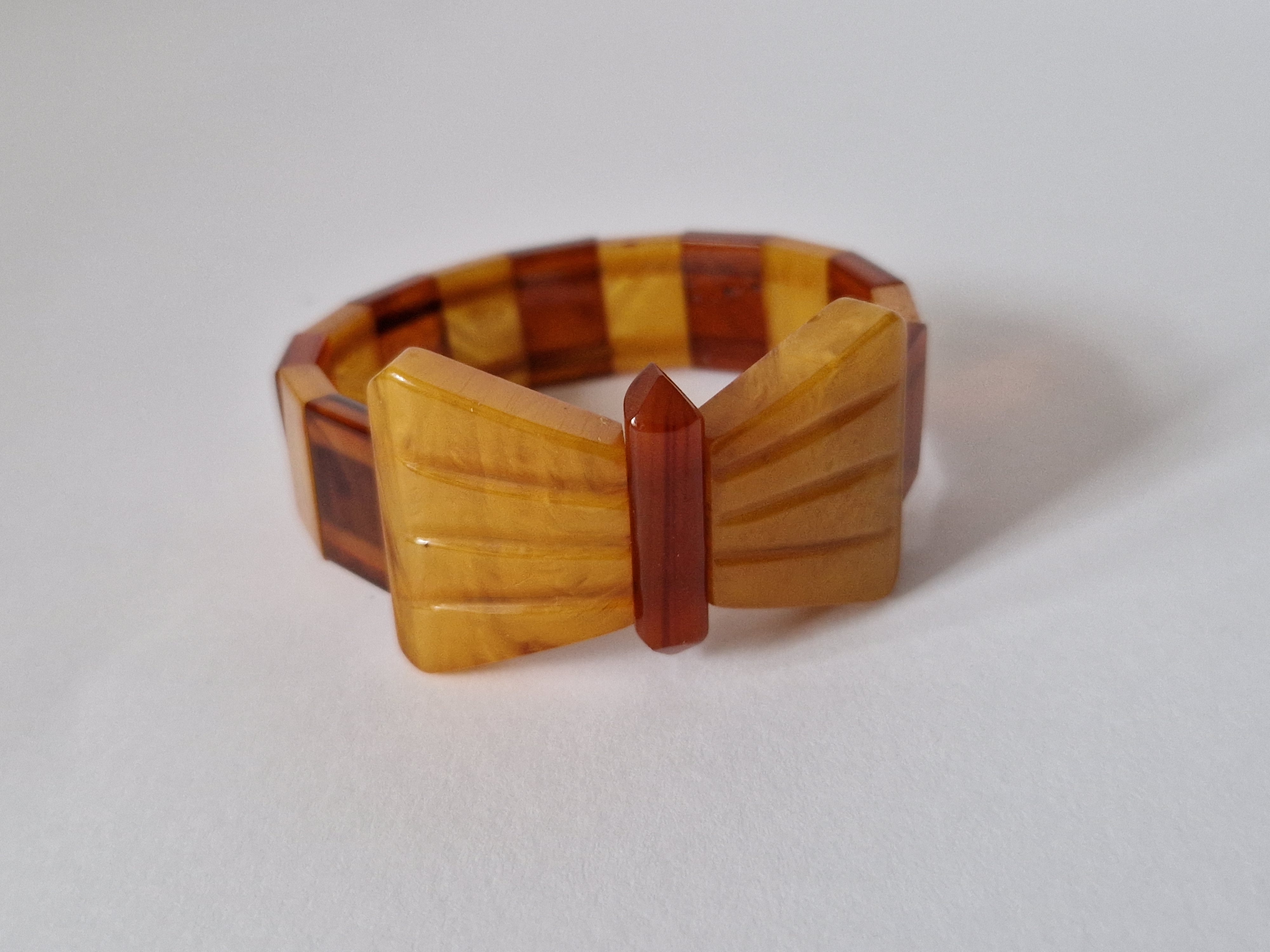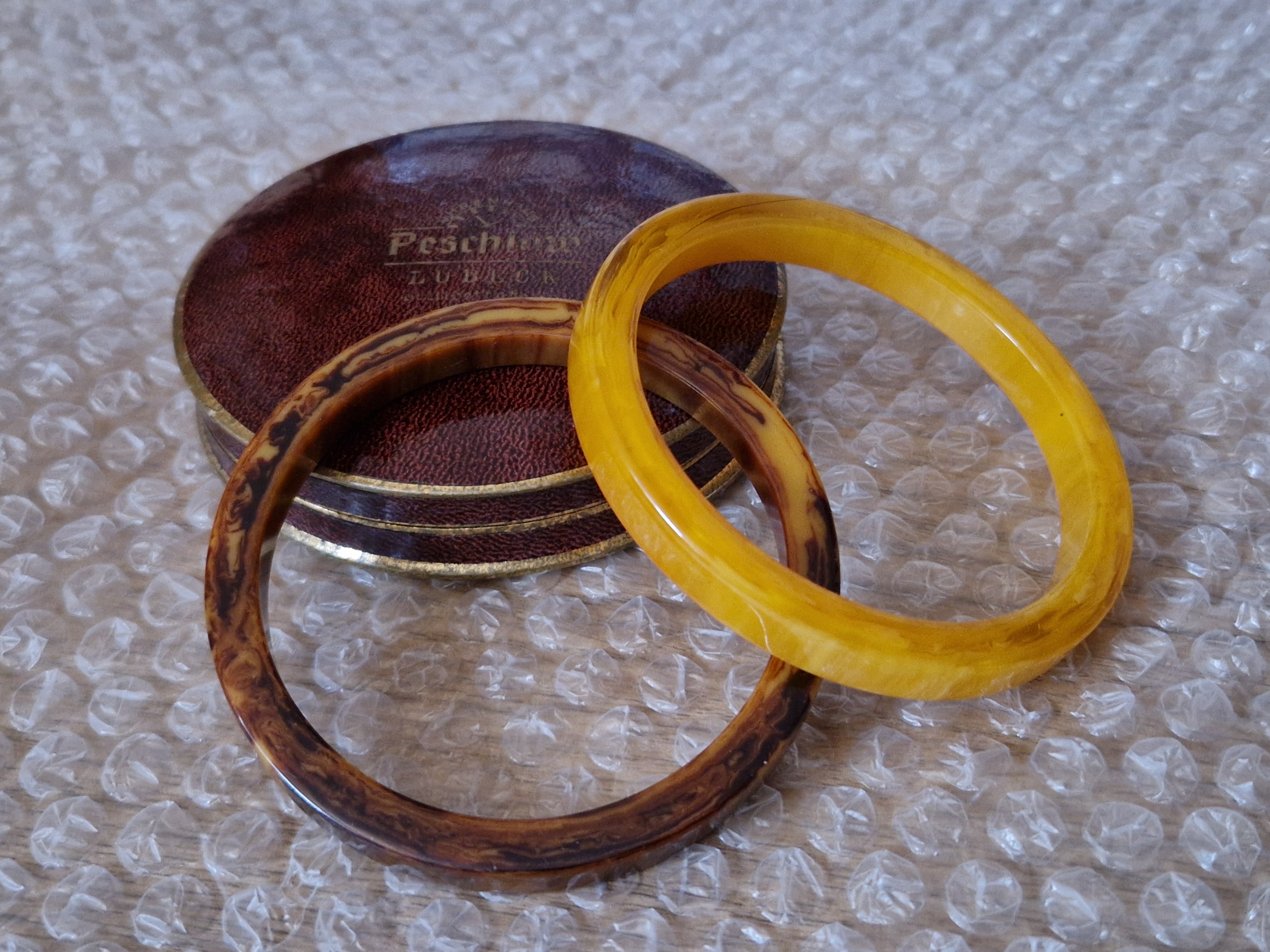 Smycken är tillverkade i mässing och galalith, en bakelit-liknande plast gjord på mjölk (!). Detta armband ingår i min samling. Har även två broscher med ”rätt” märkning.