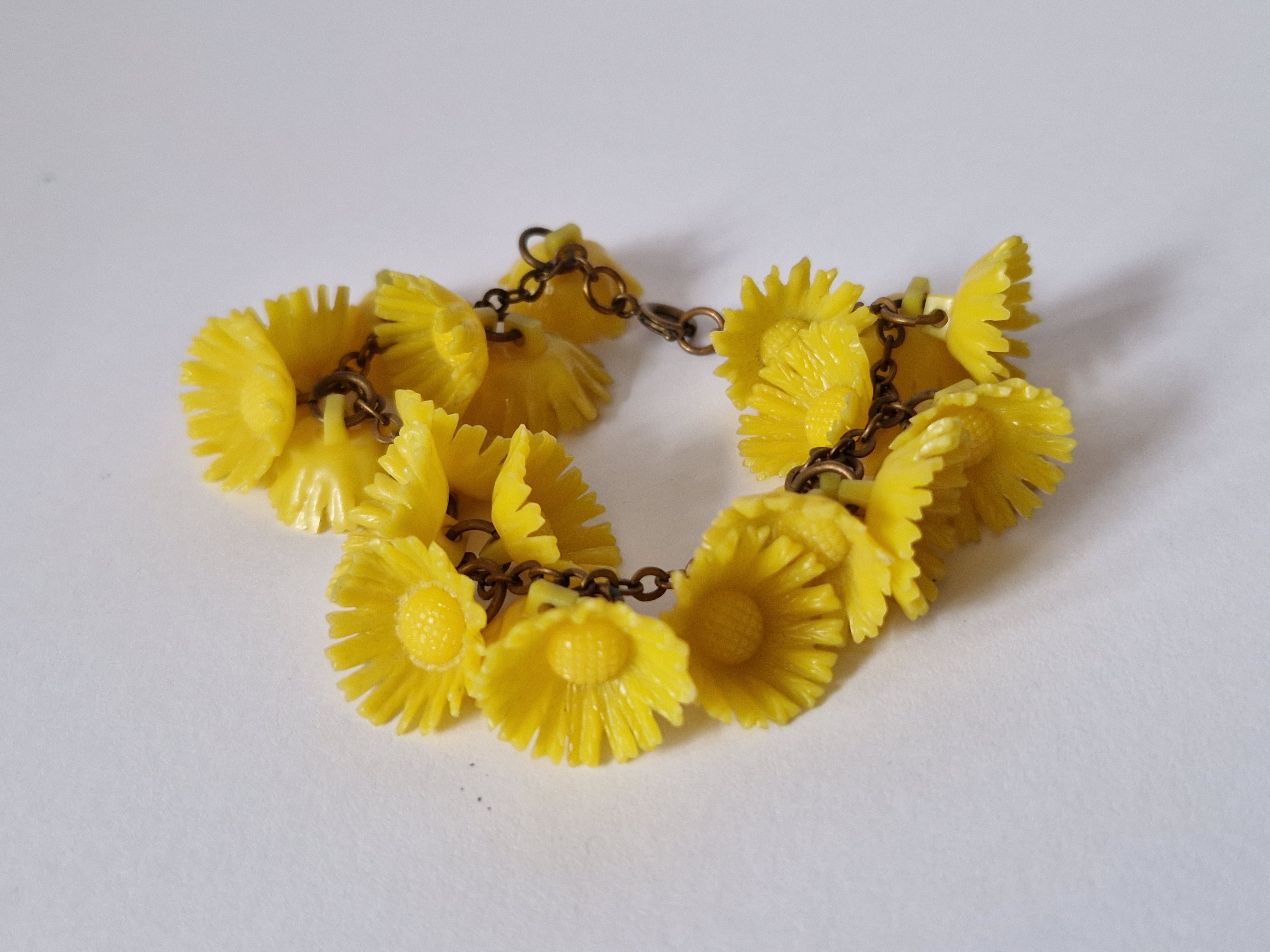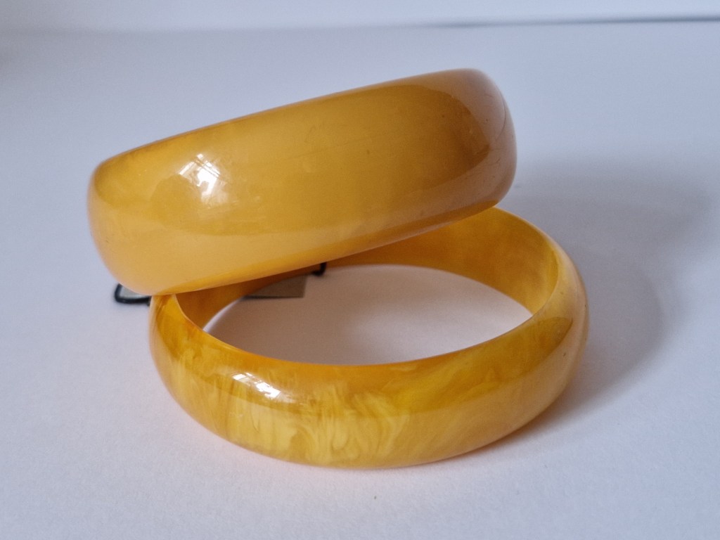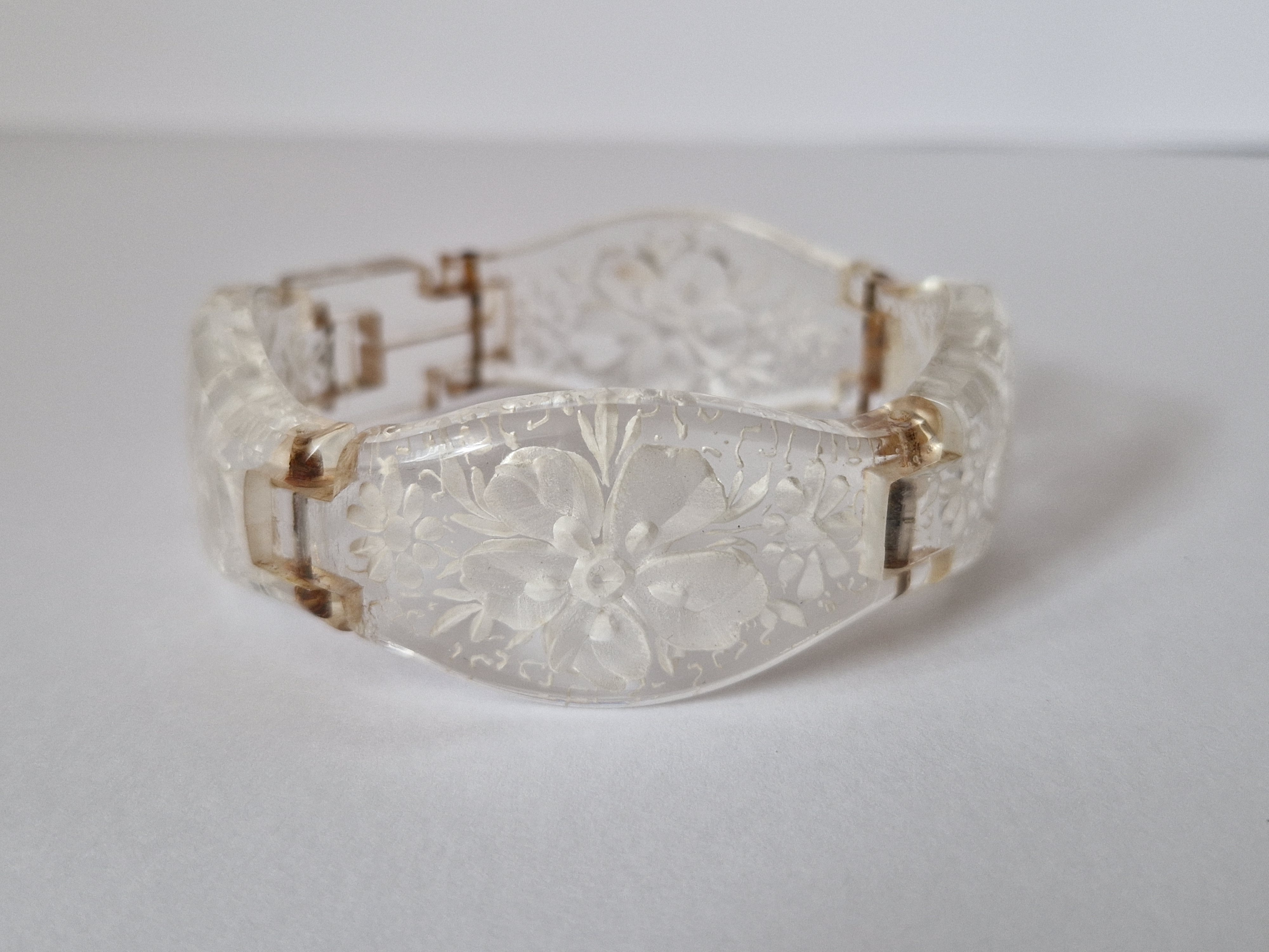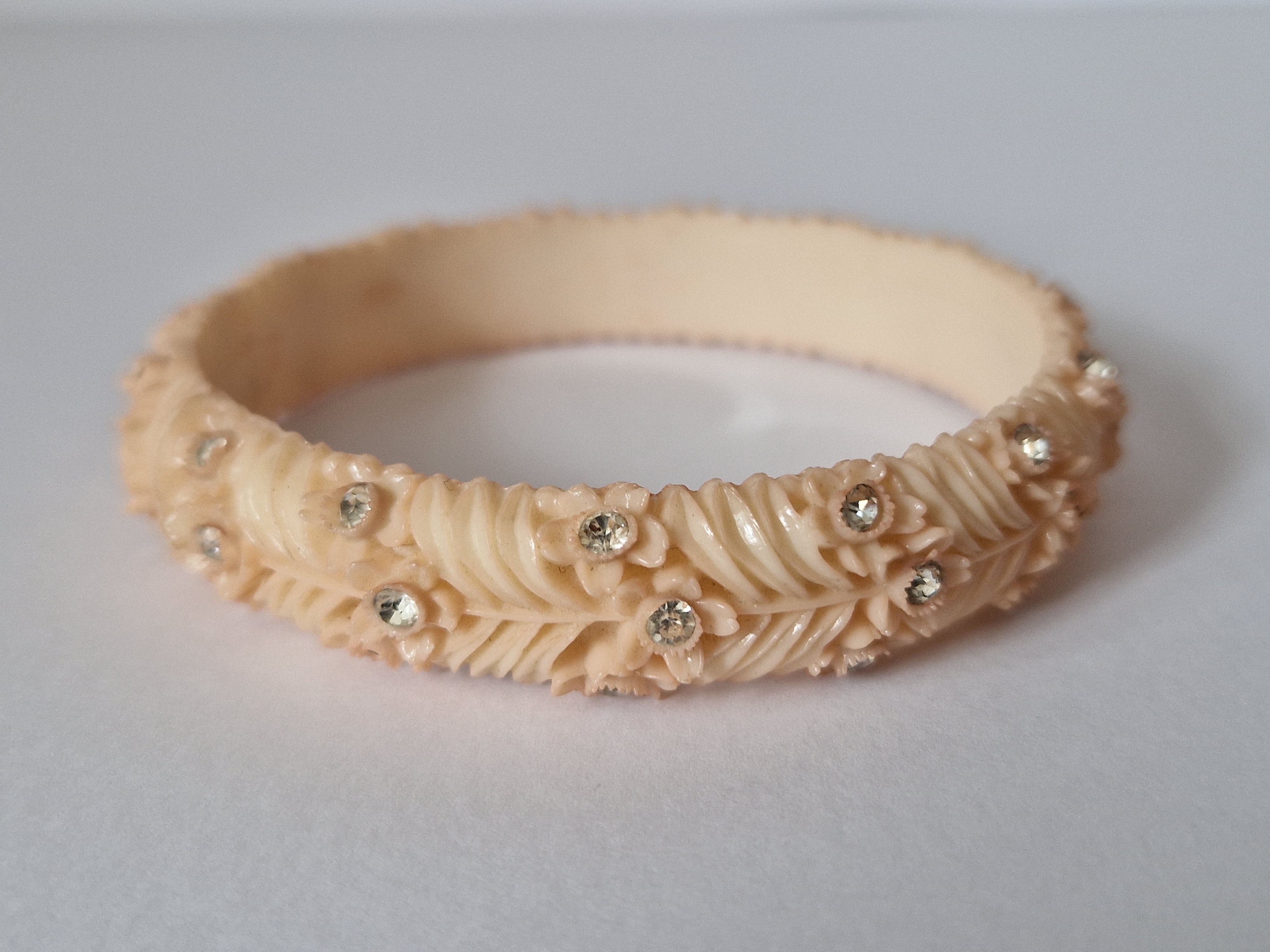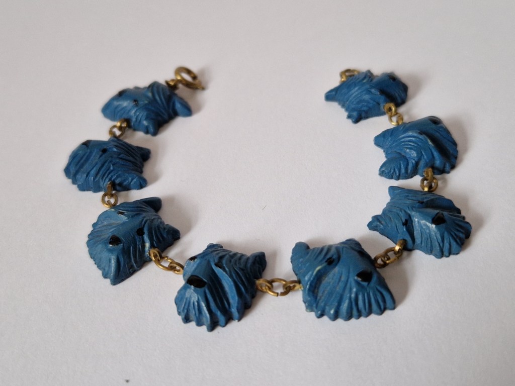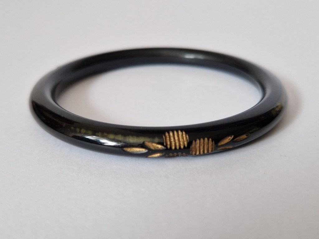 Smycken är tillverkade i mässing och galalith, en bakelit-liknande plast gjord på mjölk (!). Detta armband ingår i min samling. Har även två broscher med ”rätt” märkning.