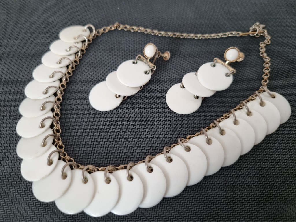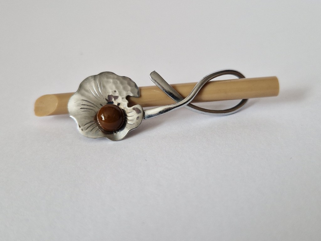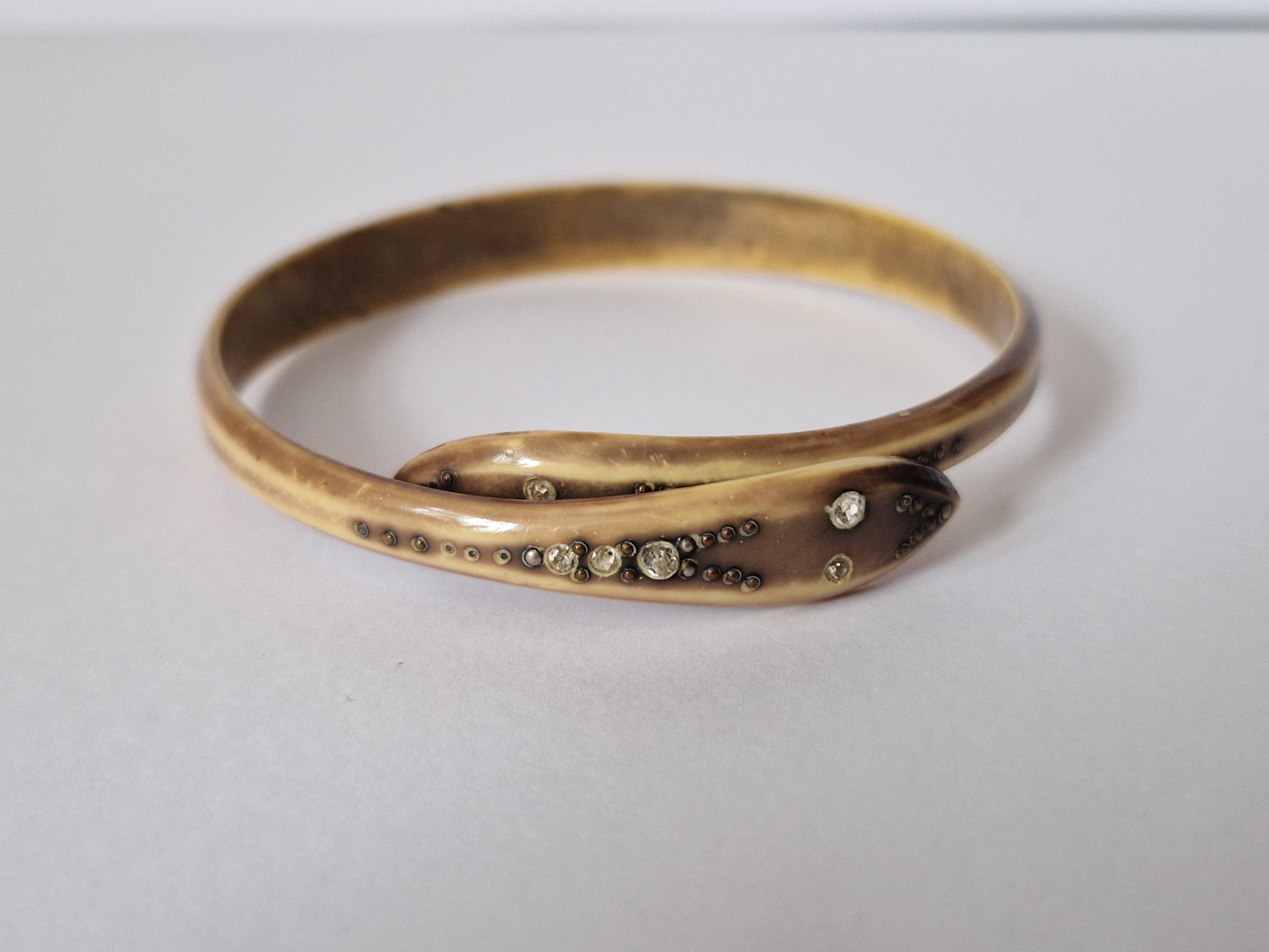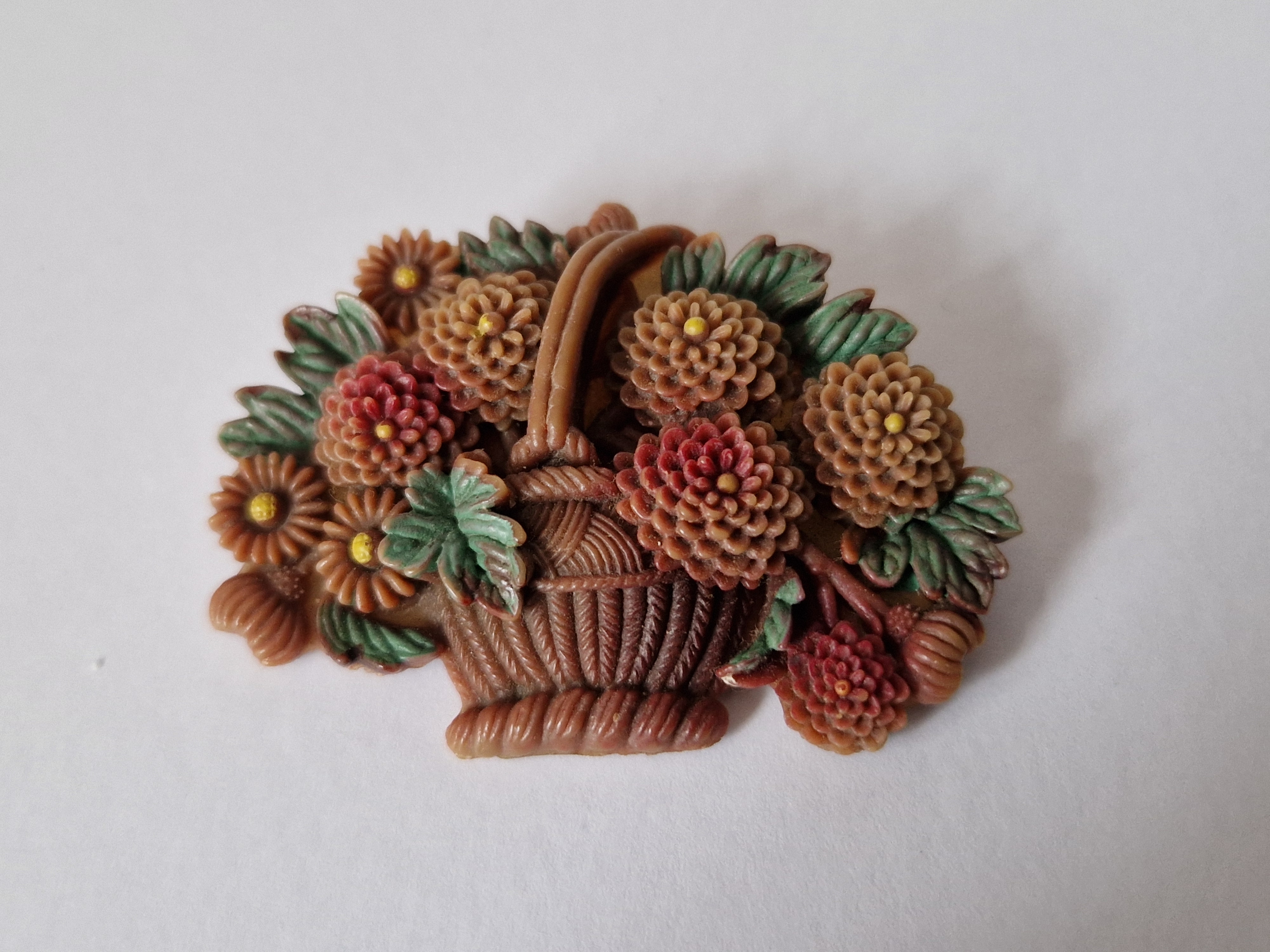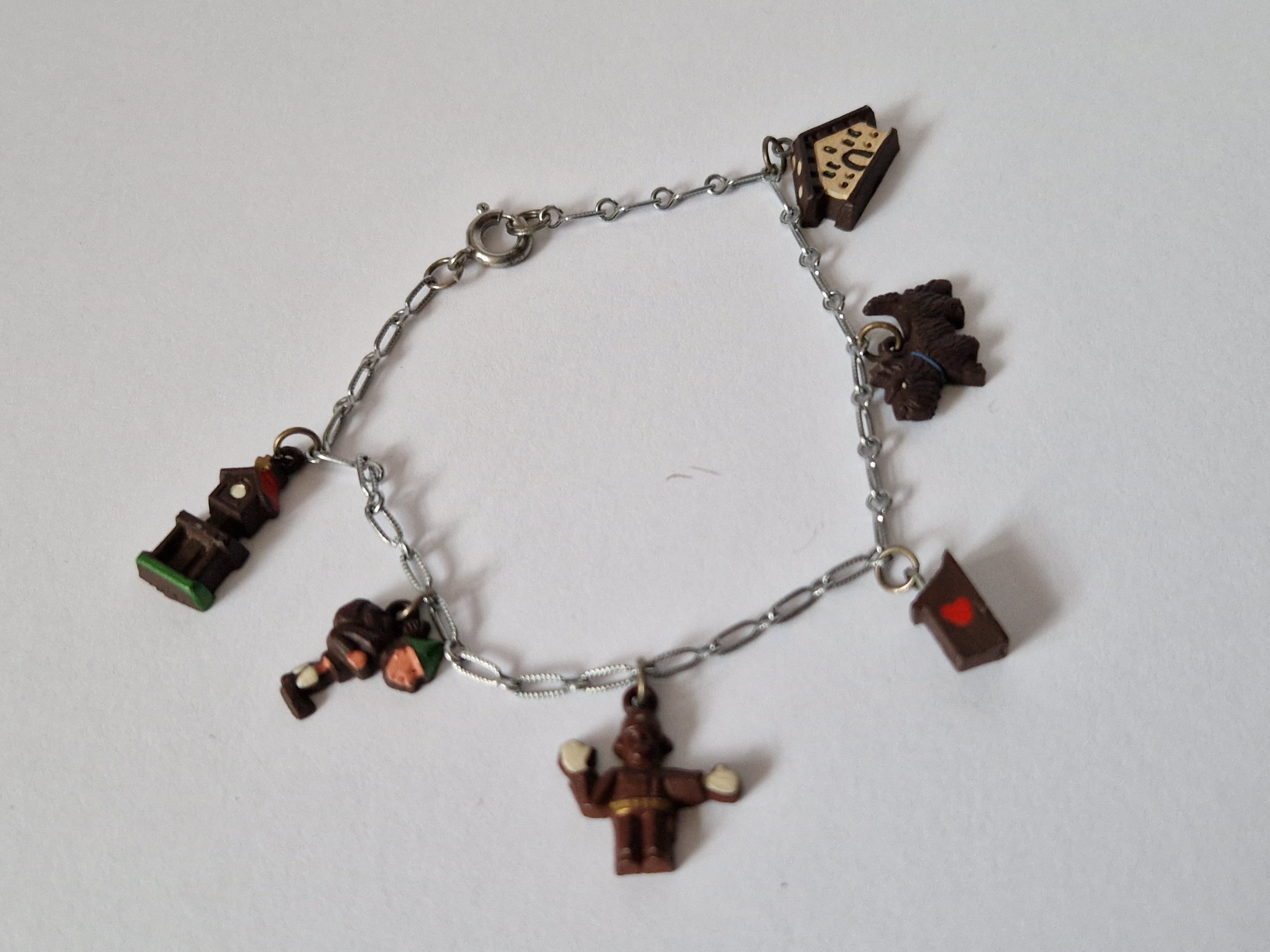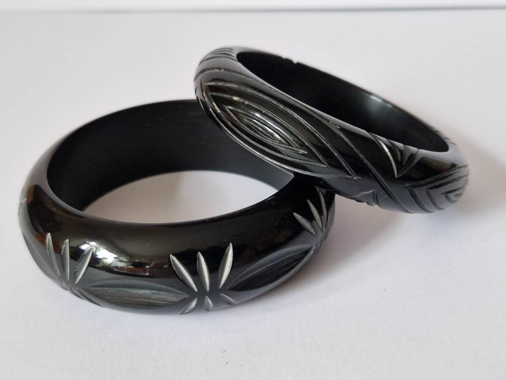 Smycken är tillverkade i mässing och galalith, en bakelit-liknande plast gjord på mjölk (!). Detta armband ingår i min samling. Har även två broscher med ”rätt” märkning.