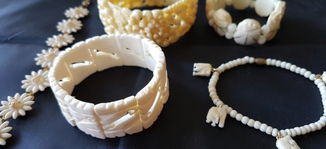 Det som är ännu knepigare att se skillnad på är dels äldre skurna/snidade smycken, dels halsband med pärlor och liknande, där kan det vara extremt svårt att se skillnad eftersom många varianter gjordes både i ben och plast.