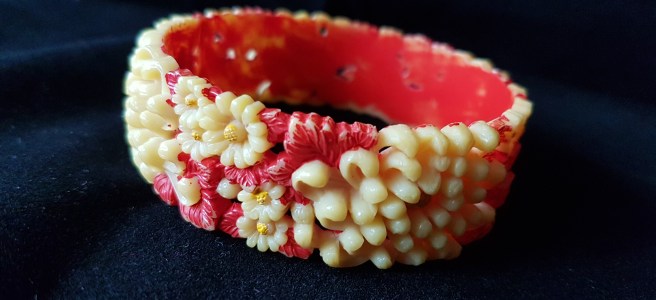 Några armband, ett nytt i celluloid från 30/40-tal med det ovanliga att det har en märkning i med två bokstäver – är det någon som varit inblandad i skapandet eller är det en tidigare ägare tro? Två stela armband som jag är lite tveksam till om de är tillräckligt gamla för mig och slutligen ett brunmelerat med guldfärgade detaljer som enligt uppgift är från 60-talet.