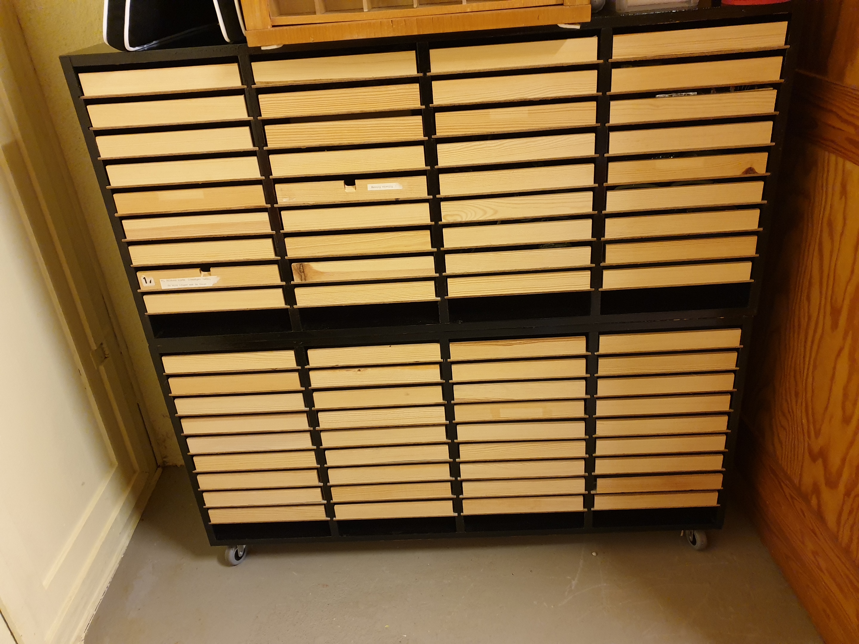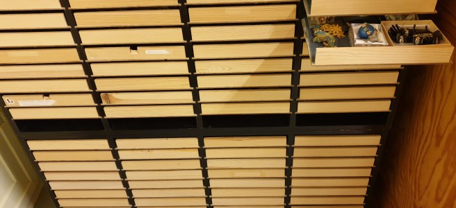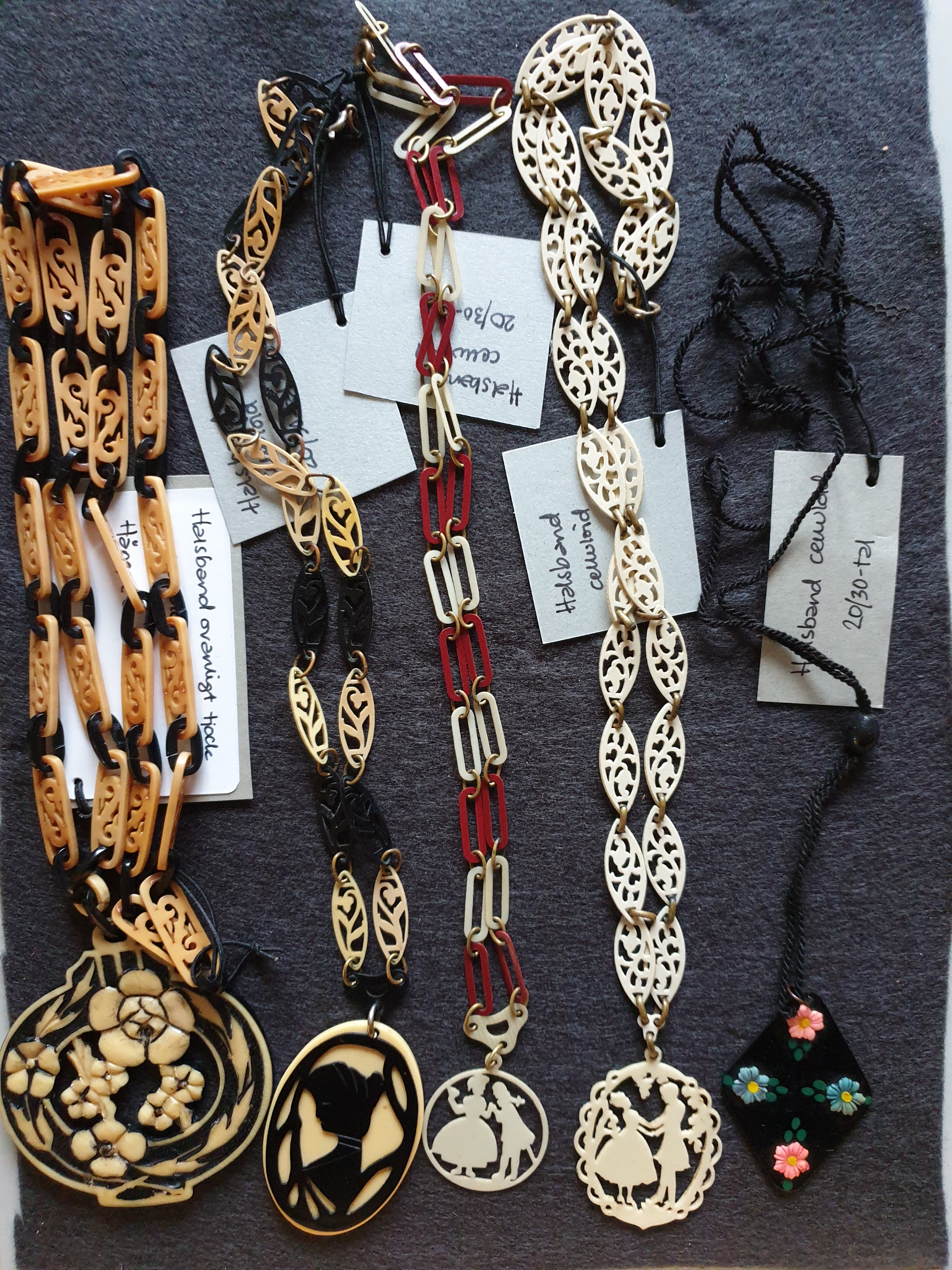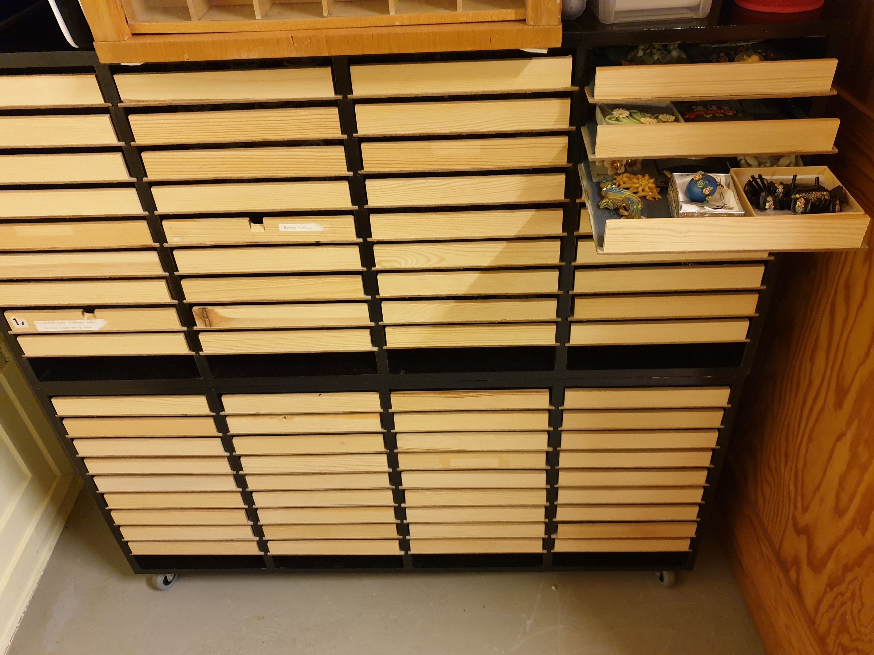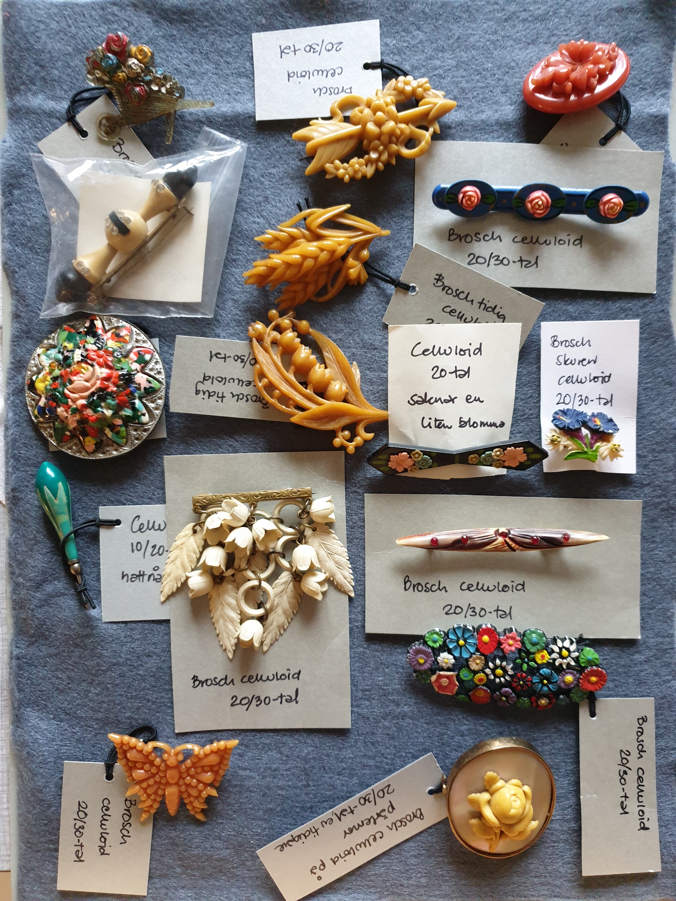 … jag plockat om den äldsta delen av samlingen? Jag kämpar hela tiden med hur jag ska förvara och katalogisera samlingen och naturligtvis börjar jag alltid bakifrån. Nu har jag köpt ytterligare ett skåp och jag har bestämt mig för att ha den äldsta, och sköraste, delen av samlingen där. Det är smålådor vilket innebär att jag kan sprida ut och lägga dem var för sig och då behöver jag inte ha dem med stenar liggande i plastpåse med rädsla för att tappa stenar om jag plockar bland dem. Det florerar teorier att det inte ska vara bra att förvara gamla plastsmycken i plastpåse men ingen jag har pratat med vet om det är sant eller inte. Men bara för att vara på den säkra sidan plockar jag ut dem från de plastpåsar som jag hittills förvarat dem i. De blir också lättare att se när de dels inte ligger i plast, dels är lite mer utspridda. Har också lagt filt i botten på alla lådor så de dels ska ligga stilla, dels ska ligga mjukt och förhoppningsvis inte skadas. Tidig celluloid (och alla andra varianter man försökte med) kan vara väldigt skört och behöver hanteras med omsorg och försiktighet.