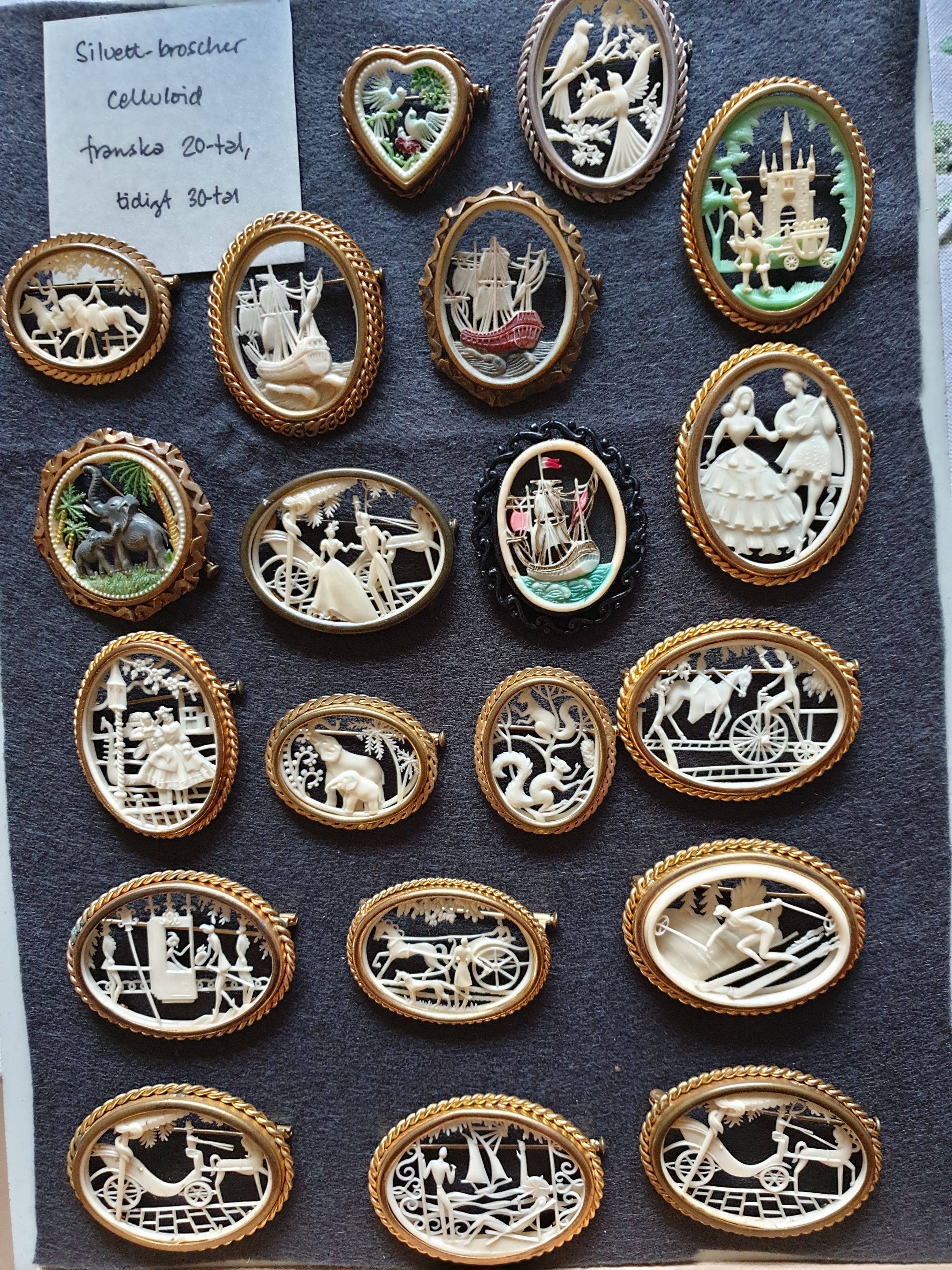 Jag har också flyttat mina siluett-broscher till samma ställe, de flesta av dem tillhör 20-talet. De som jag bedömer är senare kommer att vara i ”sin” ålderskategori. Ska försöka hålla mig till ålder i min katalogisering och inte ha så många små ”undersamlingar”. Jag kan ju ha dem för sig ändå men ändå under ålder tänker jag, rädd att jag aldrig får någon riktig ordning annars. Även sorgesmycken ska få flytta in men de behöver jag åldersbestämma lite bättre innan jag gör det.