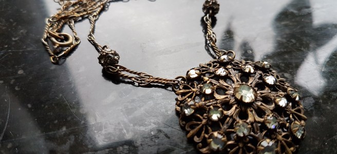 Hittade en fin äldre kedja som var handgjord. Passade inte alls till halsbandet jag höll på med men jag gick igång lite på den där kedjan och började istället leta efter någon brosch, knapp eller liknande som skulle kunna bli ett lämpligt hänge till kedjan. Hittade en vacker gammal stor knapp med ofärgade stenar som hade samma ”gamla” färg som kedjan. Och helt plötsligt höll jag på med ett helt annat halsband än det jag började med…