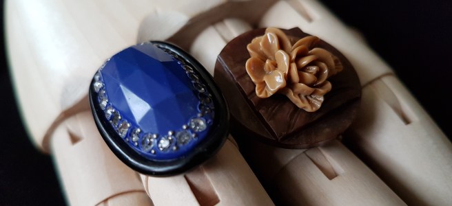 Först ringarna. Alla stommar är nya och justerbara, resten består av gamla knappar, udda clips-örhängen, spännen och en och annan söndrig brosch.