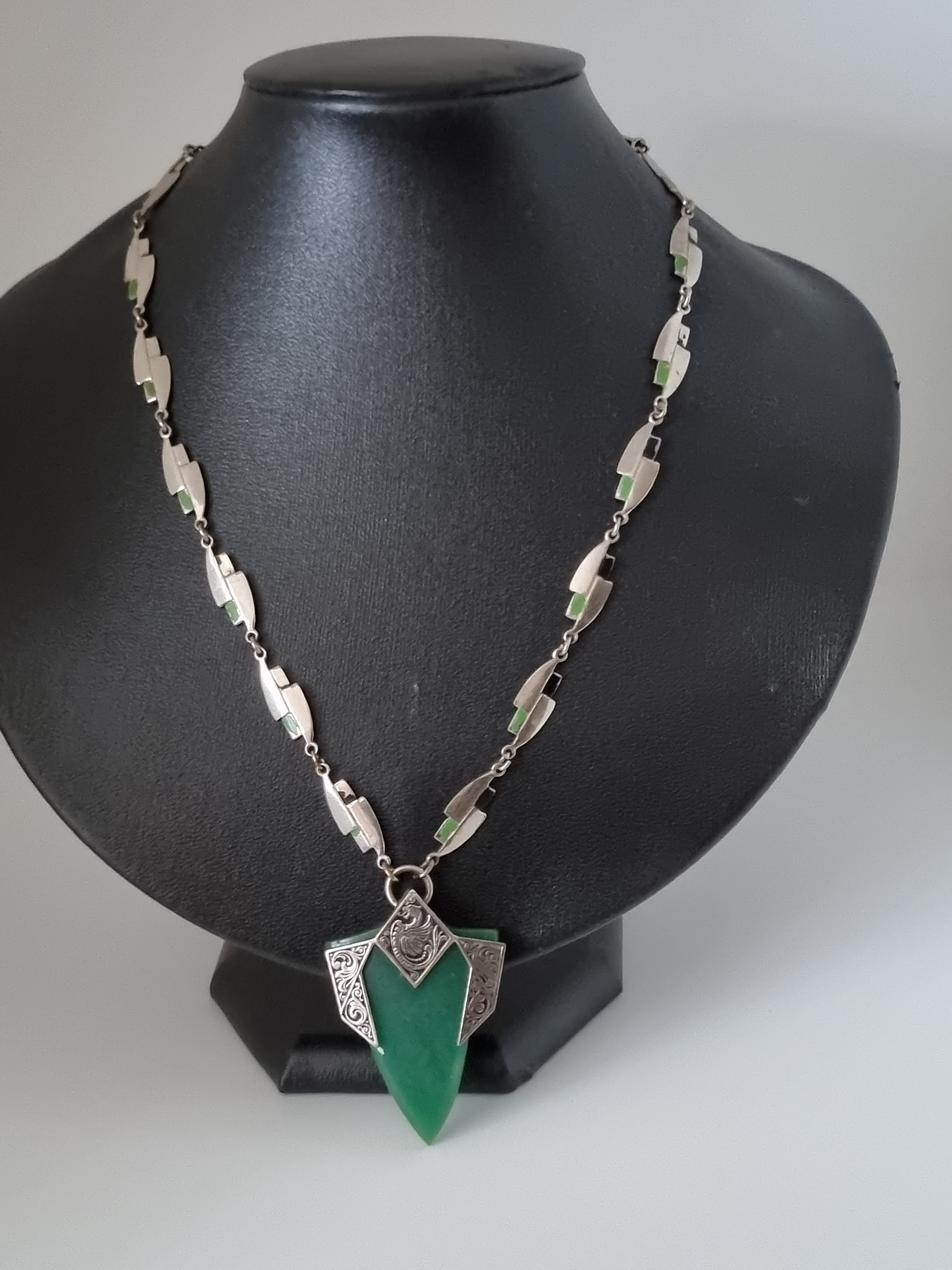 Dyrgripen är detta fina/häftiga halsband i krom och galalith från 30-talet i art deco-stil.