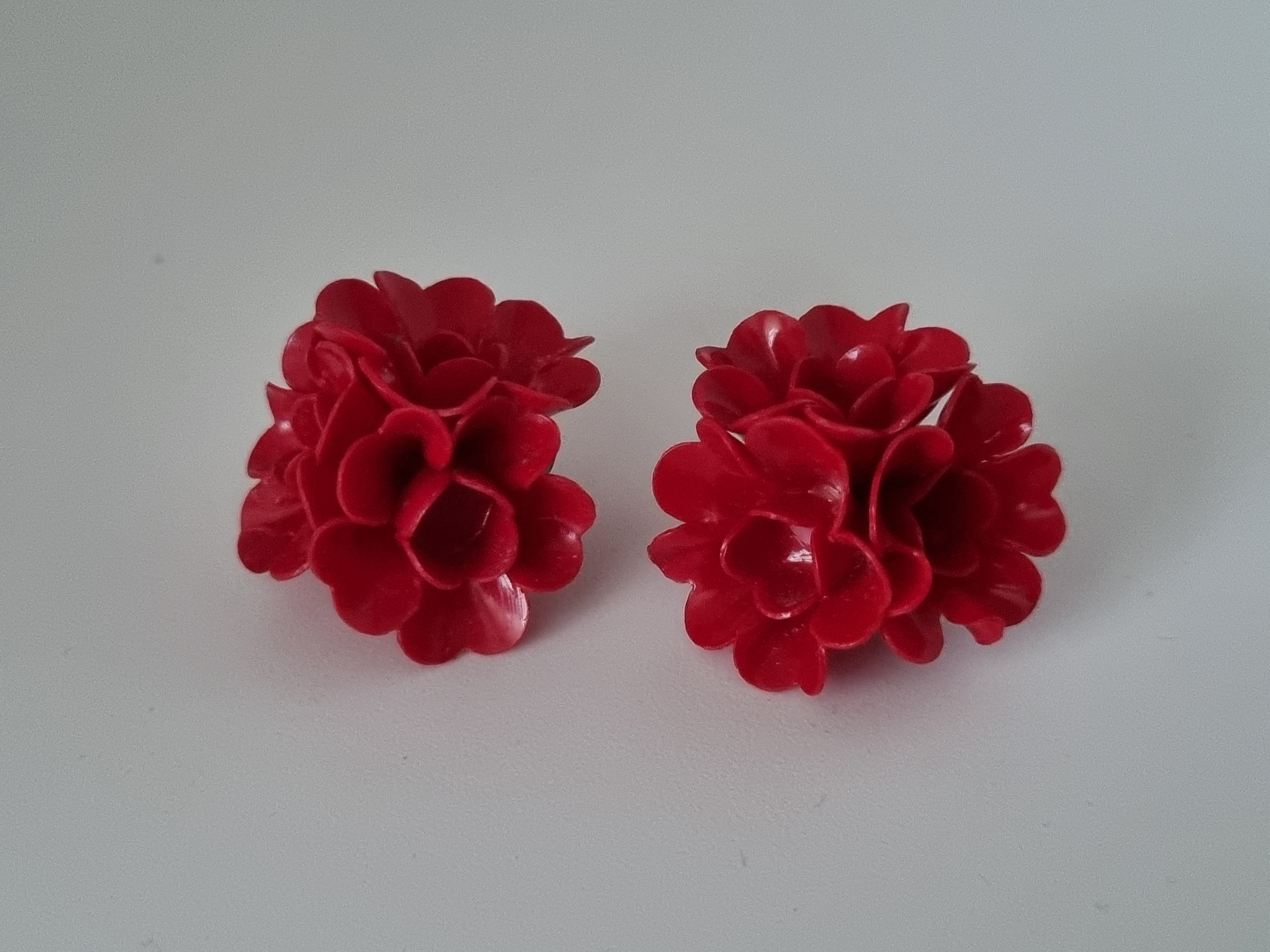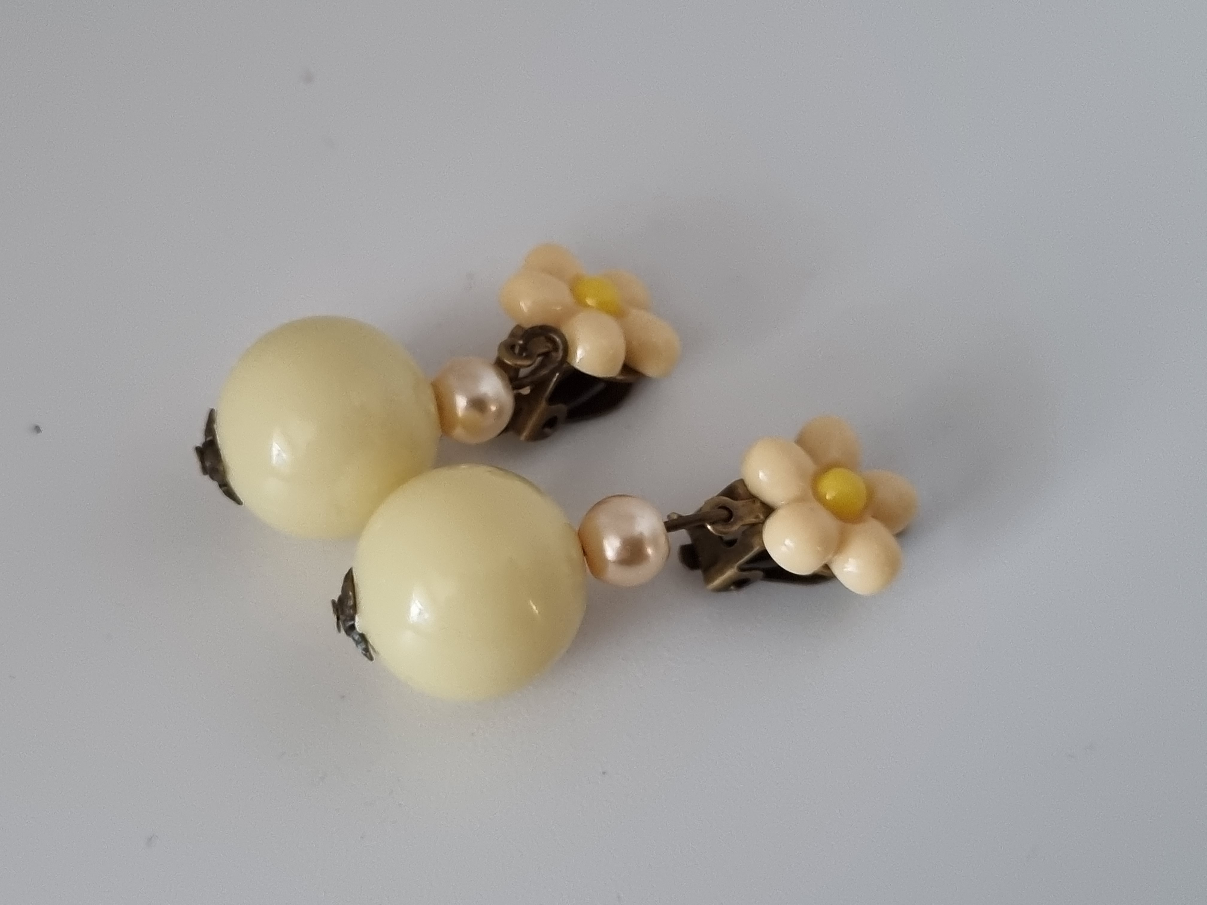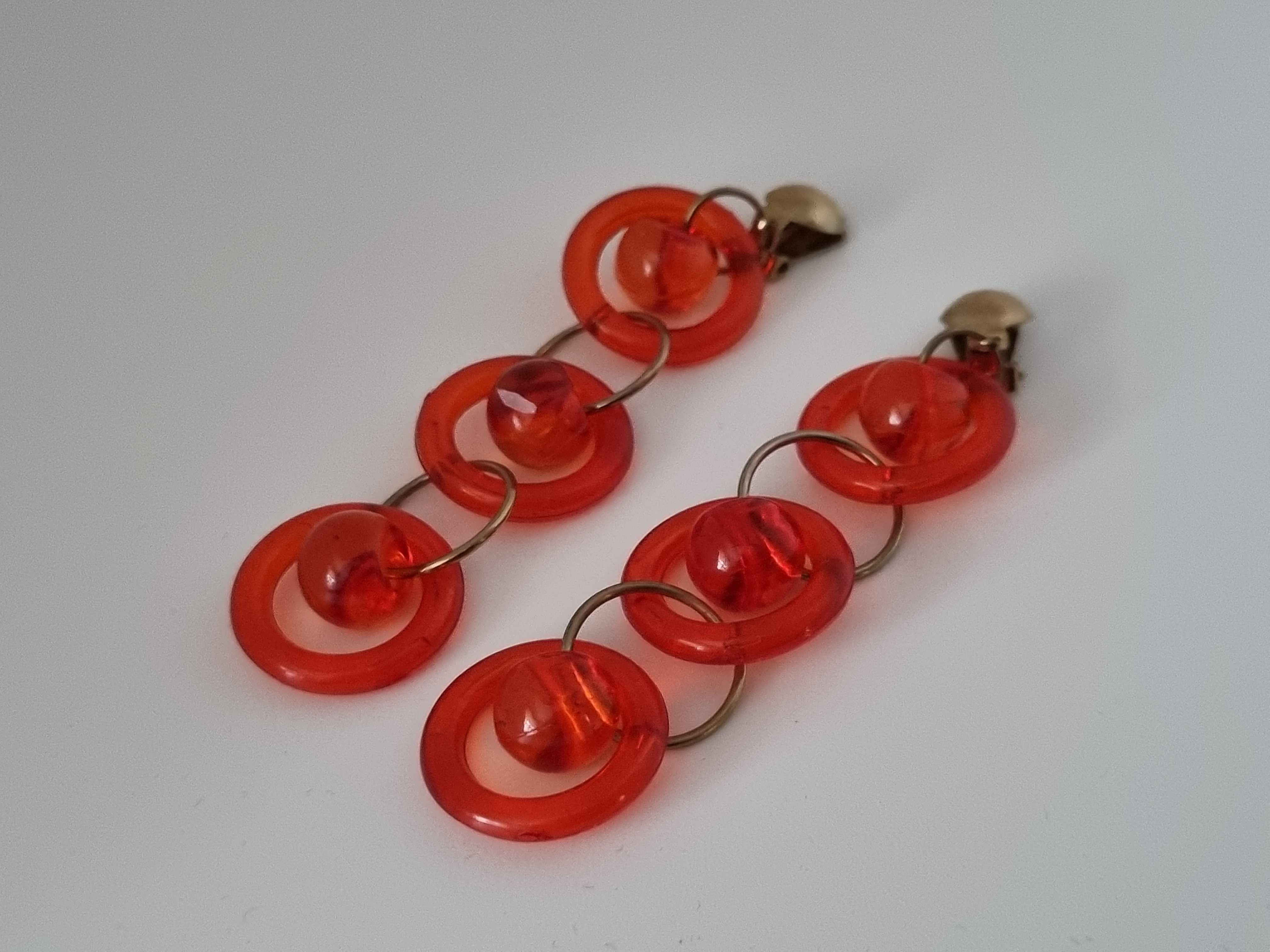 Lite blandade örhängen, röda i celluloid 40/50-tal, långa röda 60-talare, ett par gula söta örhängen med blommor från 50-talet och till sist ett par i bakelit från 30-talet.