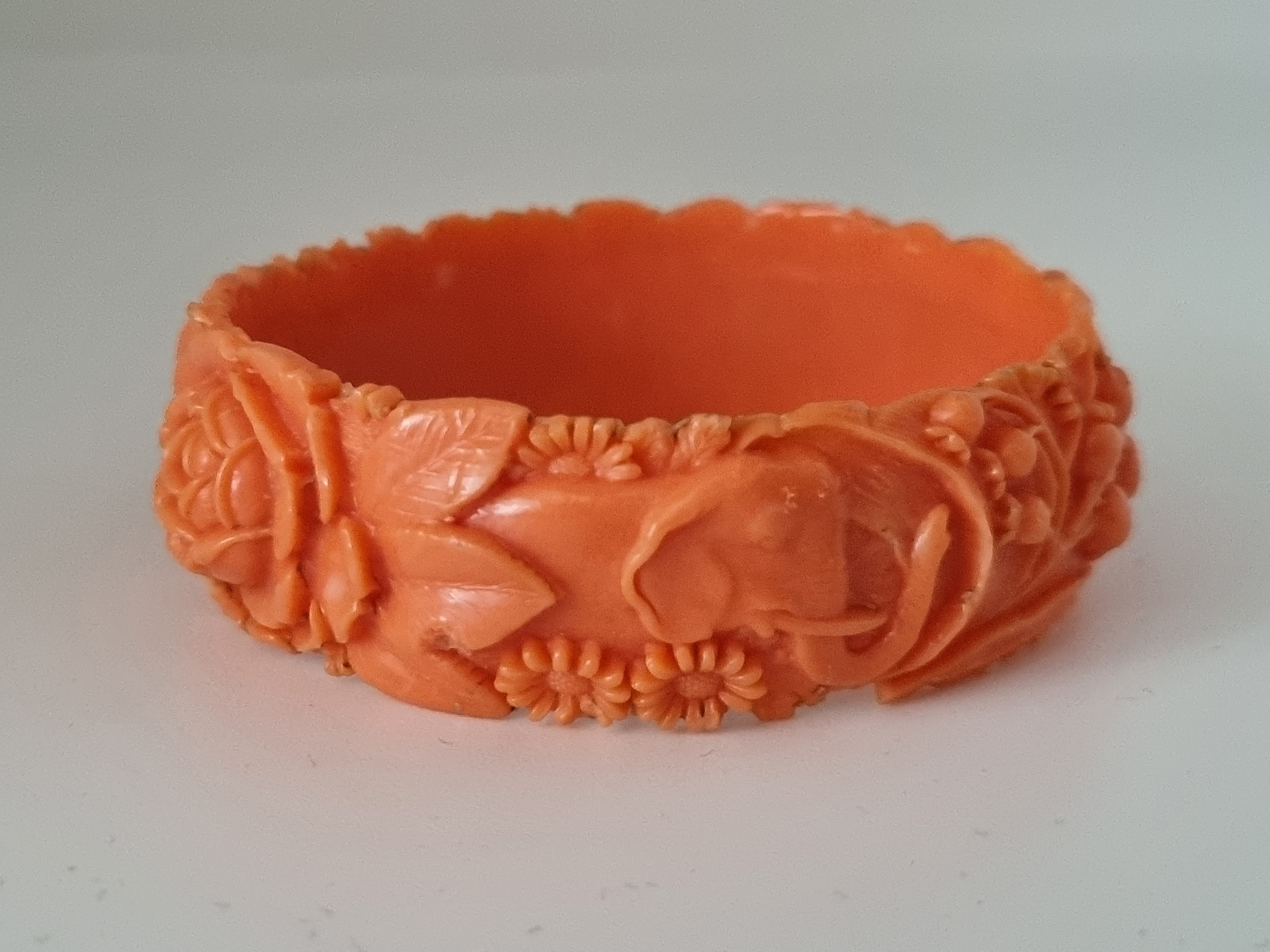 Lite bakelit, jag som brukar hävda att jag inte riktigt förstår varför bakelit ska vara det plastmaterial som är så upphaussat måste erkänna att när det gäller det vänstra armbandet förstår jag det. Bland det häftigaste jag sett, otroligt att tänka sig att det är från 30-talet och alltså närmare 90 år gammalt! Armbandet och örhängen till höger är fina men passar mer in på min vanliga synpunkt – varför ska de här egentligen vara fruktansvärt mycket dyrare än något i princip likadant i något annat plastmaterial? Nu ska jag erkänna att jag inte betalat några stora belopp, det var bara en känsla jag hade när jag såg det att det skulle kunna vara bakelit annars hade jag nog inte köpt det.