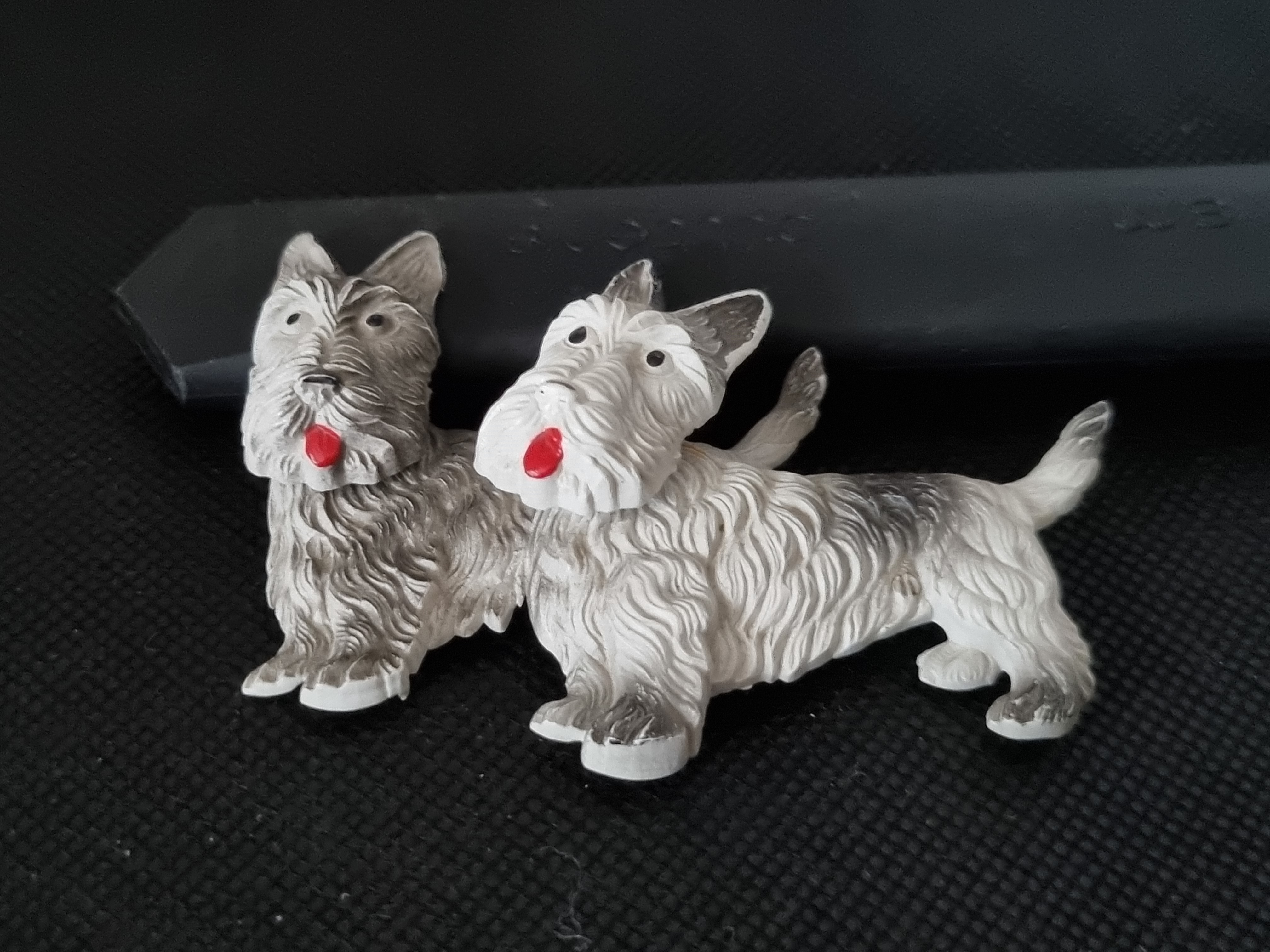 Lite hundar hittar alltid hem till mig, som fd hundägare (saknar min lille dvärgschnauzer sååå) och allmänt väldigt förtjust i hundar så är de roliga hundbroscherna från 40- och 50-talet de som jag har svårast att låta bli, tycker de är så otroligt charmiga. Den vänstra är i celluloid, den högra är jag lite fundersam över om det eventuellt är två olika plaster eller om det bara beror på att hundarna är skurna/snidade som gör att det känns så.