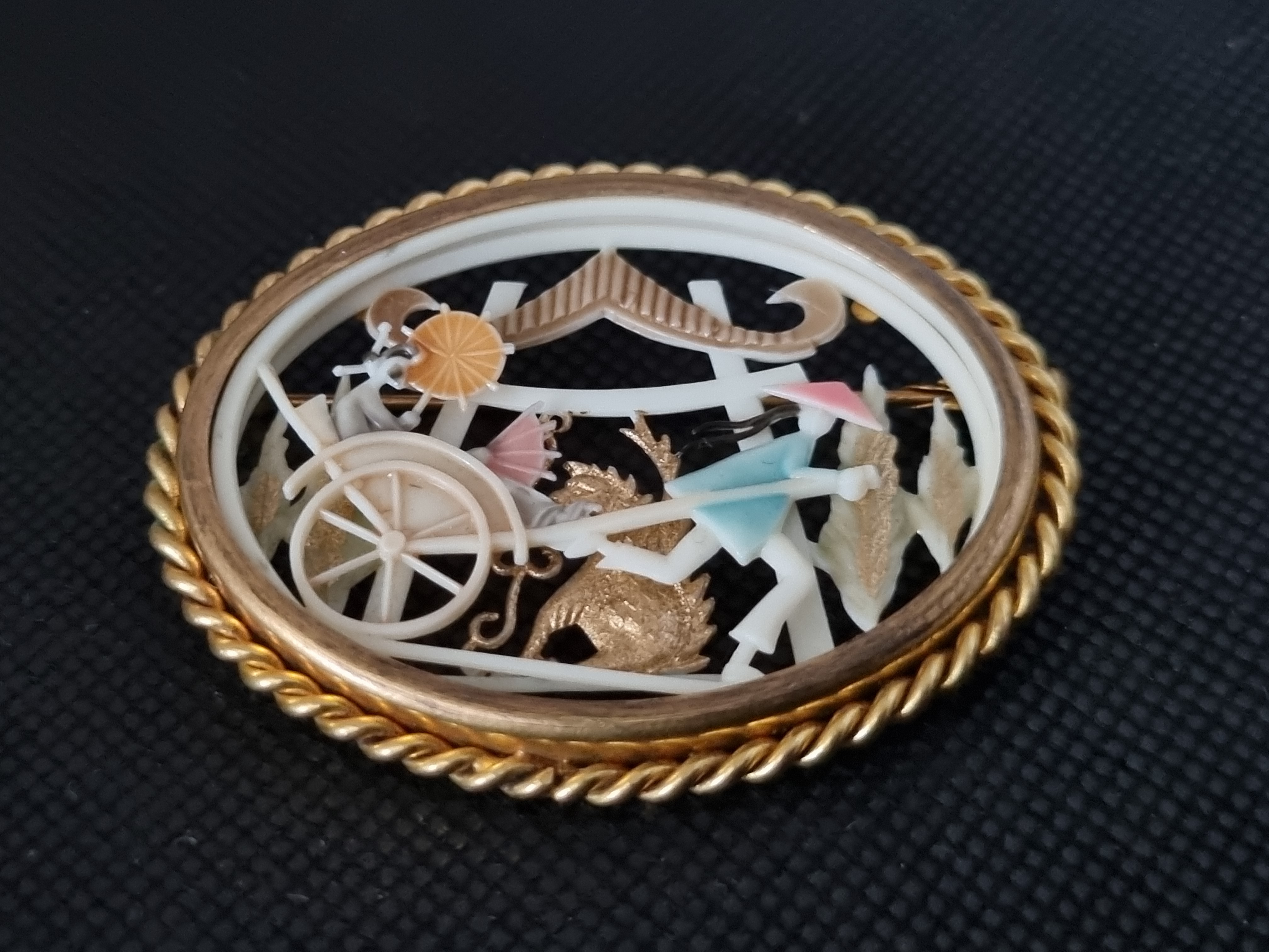 Den här broschen tillhör också bland de maffigaste i sitt slag, äger rätt många olika ”reversed carved”, alltså utskuren från baksidan, i lucite men ingen så här tjock med det här djupet på mönster. Ofta kan man misstänka att det är nyare om det är tjockt och mycket men i det här fallet är jag rätt säker på att den är från ”tiden”, dvs 40/50-tal. Det häftiga är inte bara att den är så tjock utan att mönstret är skuret på hela djupet.