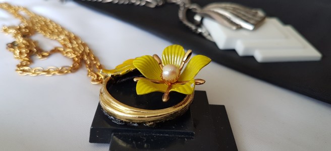 Efter några riktiga ”skitveckor” har jag i alla fall kommit så långt att dessa halsband blivit fotograferade. Jag gjorde dem klara för några veckor sedan men inte kunnat fotografera. Det gul/svarta halsbandet är gjort av två broscher, en i guldfärgad metall och en i plast, plus en guldfärgad kedja. Den vita med silverfärgad del är gjord av ett ”brosch-clip”, alltså något man oftast satte i ringningen, och en brosch i plast plus en silverfärgad kedja. Båda är lite längre.