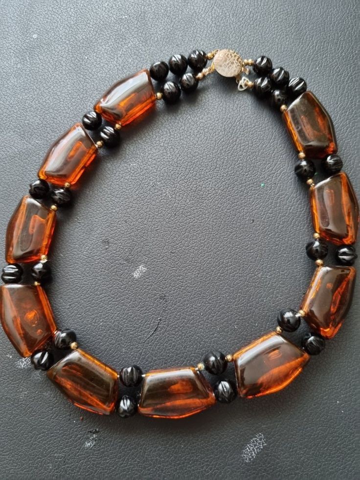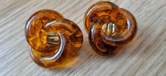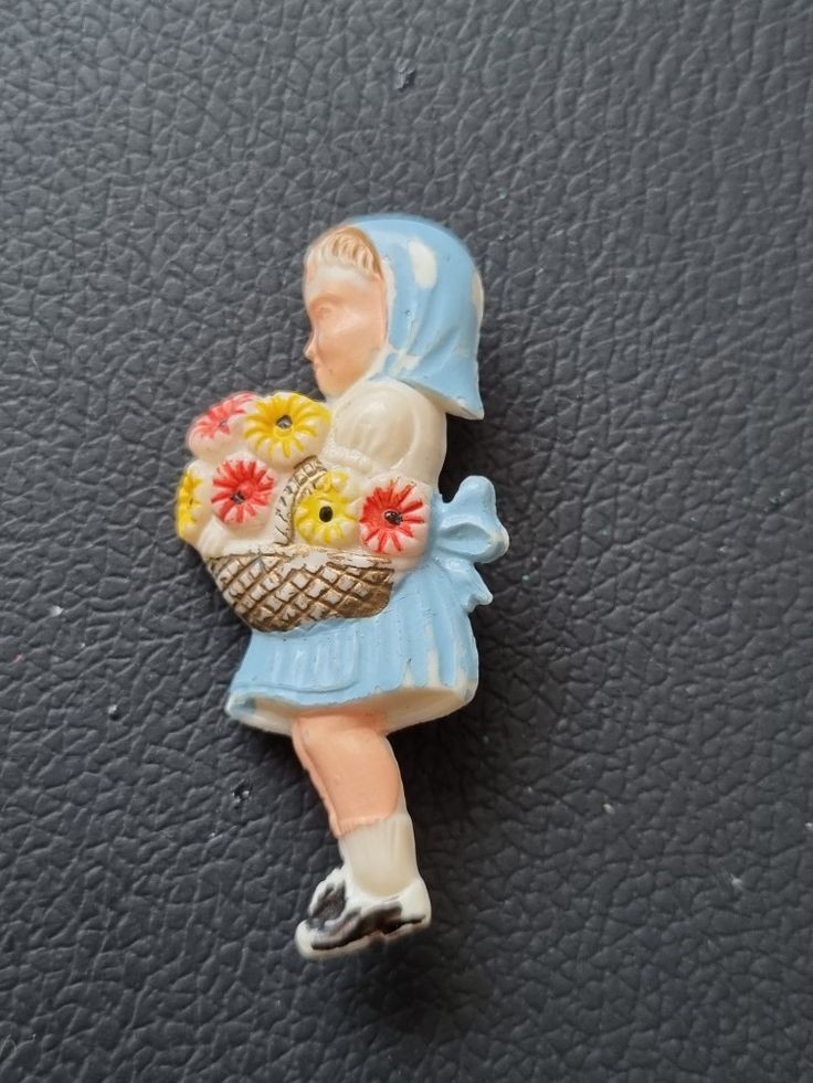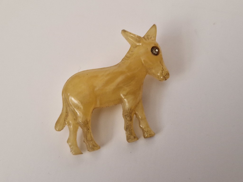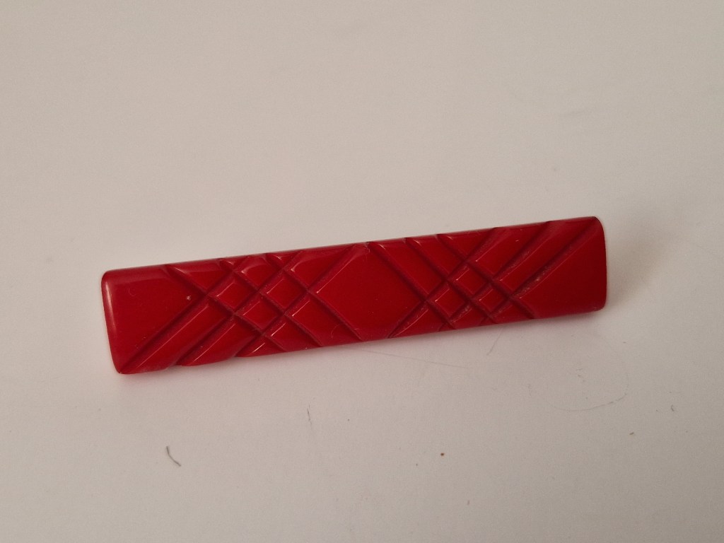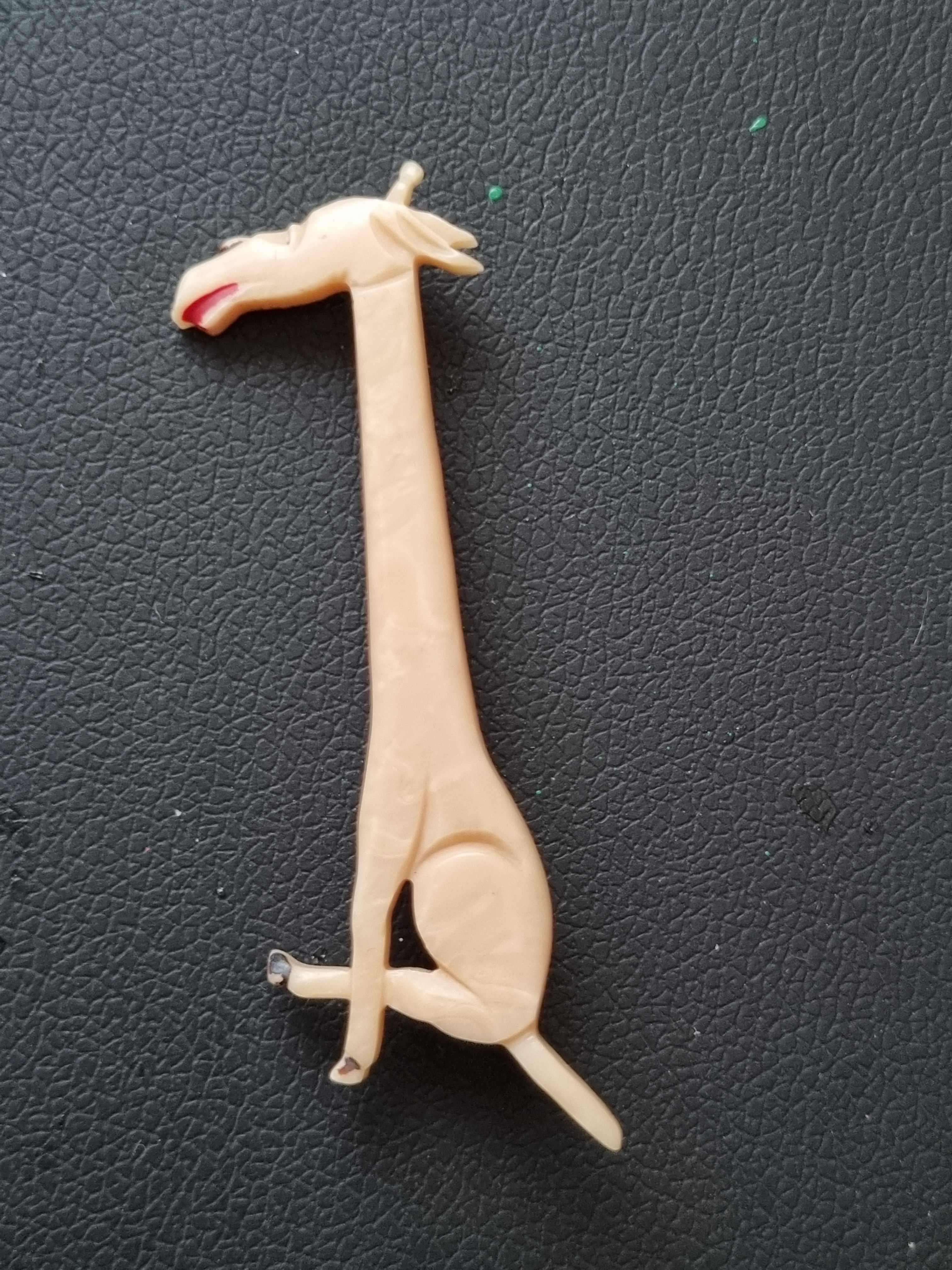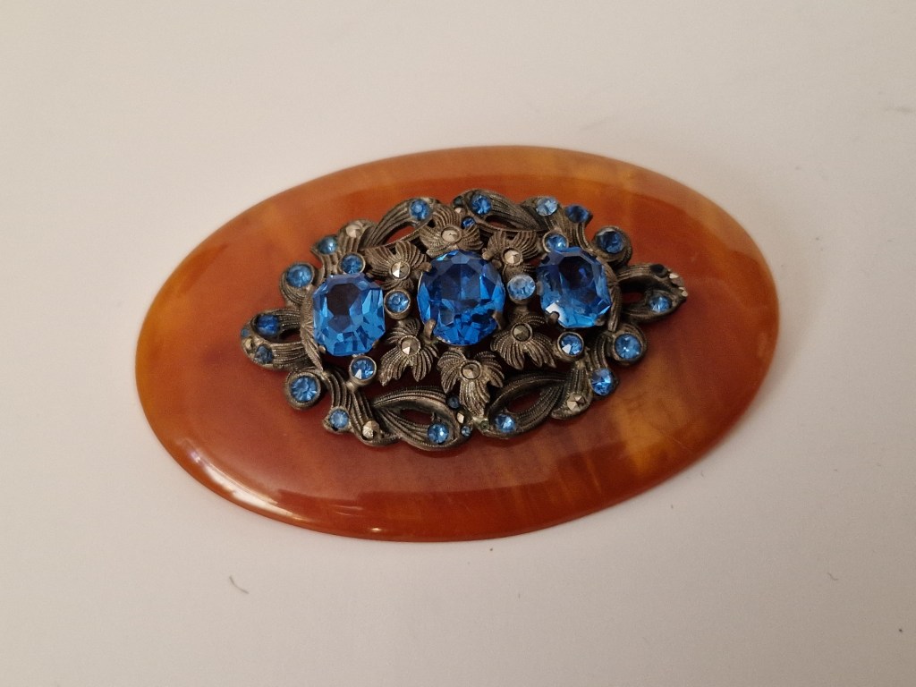 Jag har naturligtvis bara clips-broscher i plast, eller med plastdetaljer, i samlingen men det är lika vanligt att hitta dem i metall, oftast med stenar. Om de också existerade i ”finare” material, guld och silver med äkta stenar, är mer än vad jag vet men jag tror inte det var så vanligt eftersom jag aldrig sett någon. De var nog mest bijouterier som användes för att förändra eller piffa upp en klänning.