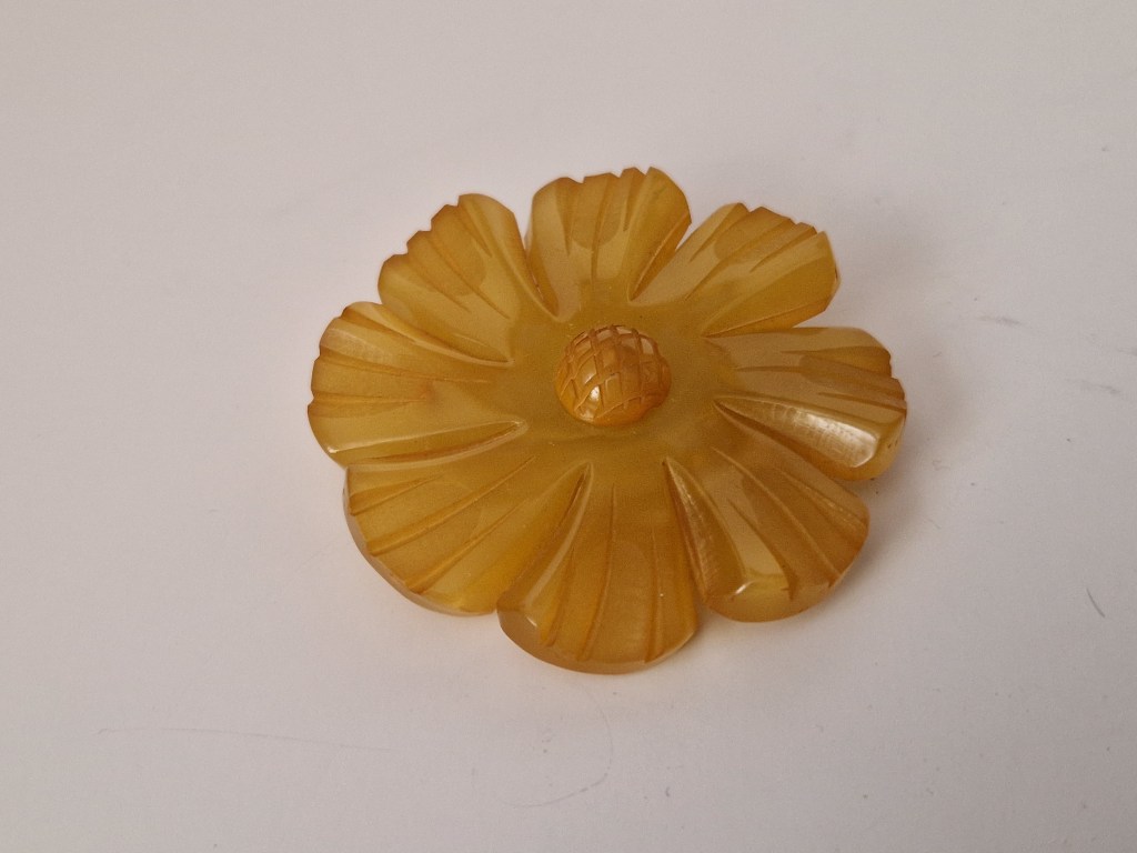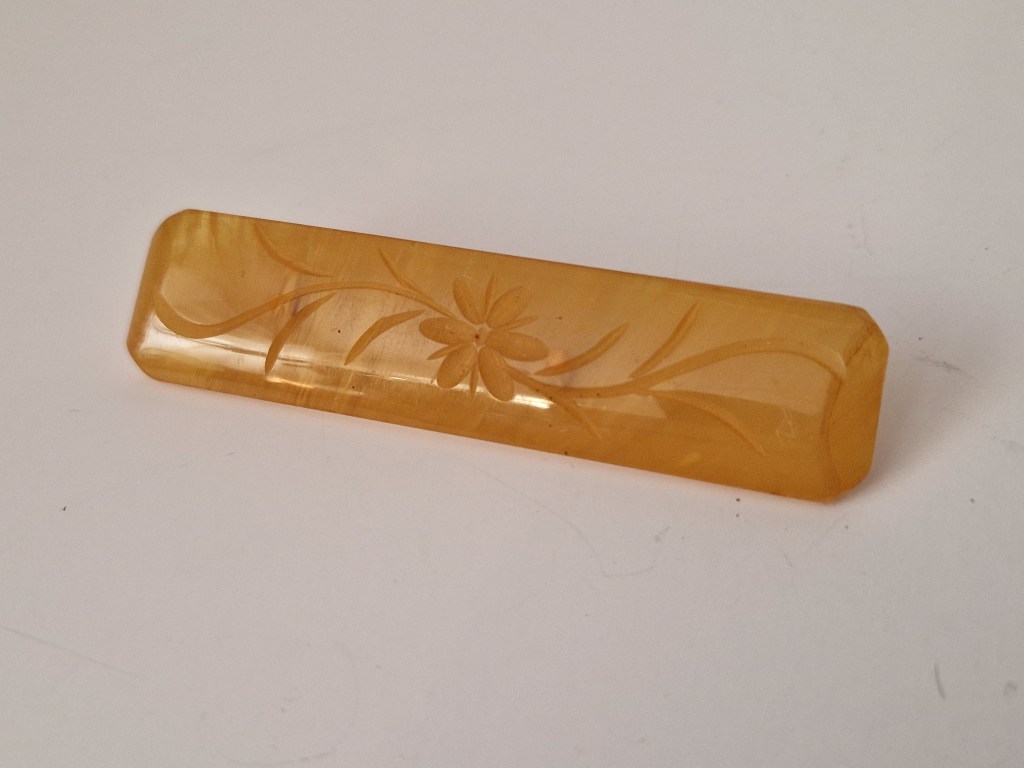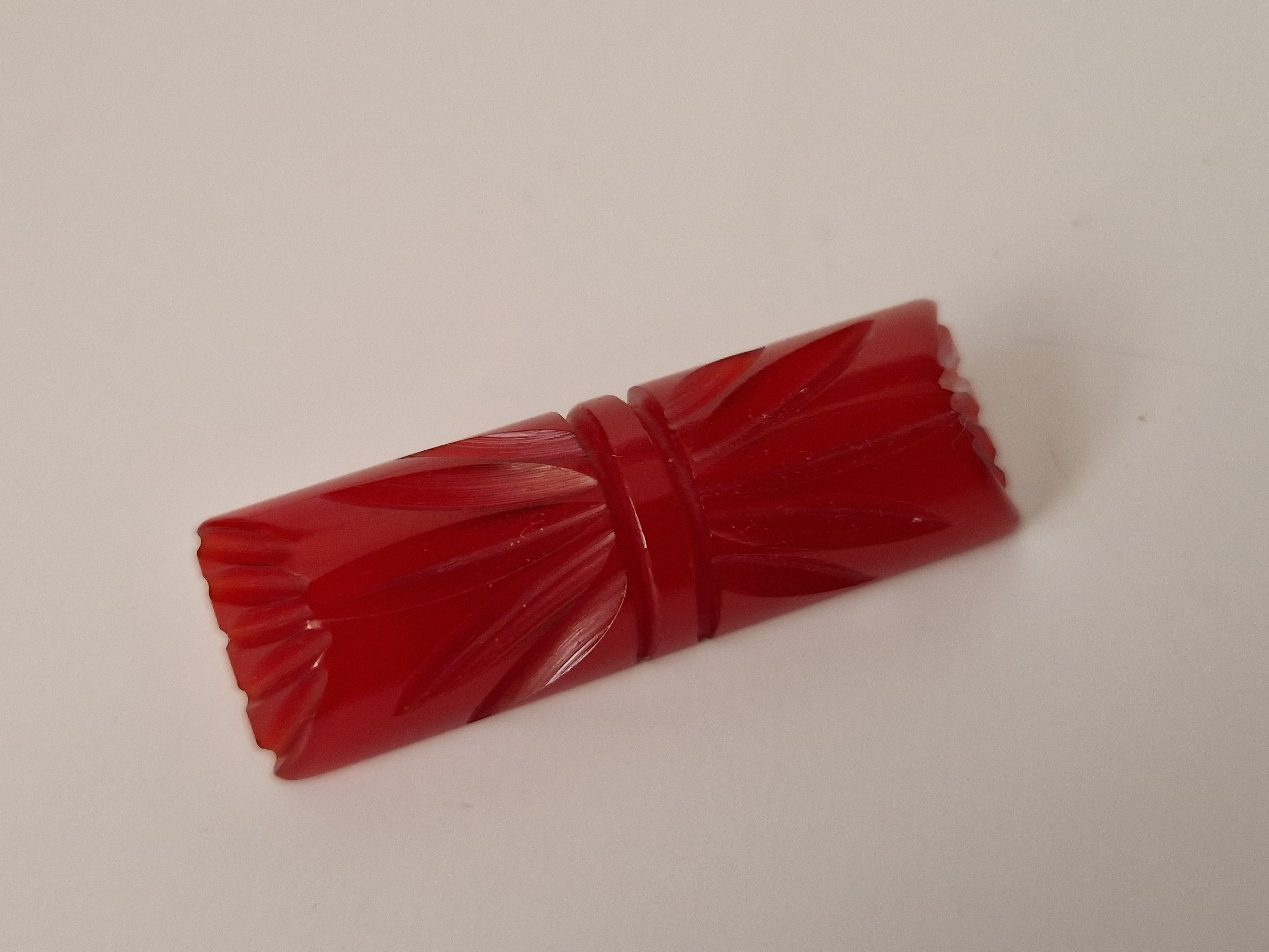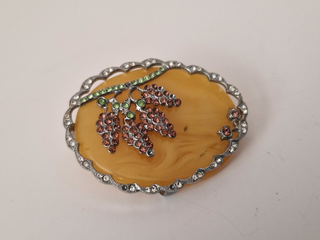 Clips-broscher i bakelit, några med kromdetaljer eller detaljer av mässingsfärgad metall. Tre av dem är sk ”reversed carved”, dvs de är skurna och målade från baksidan för att skapa en 3D-effekt.