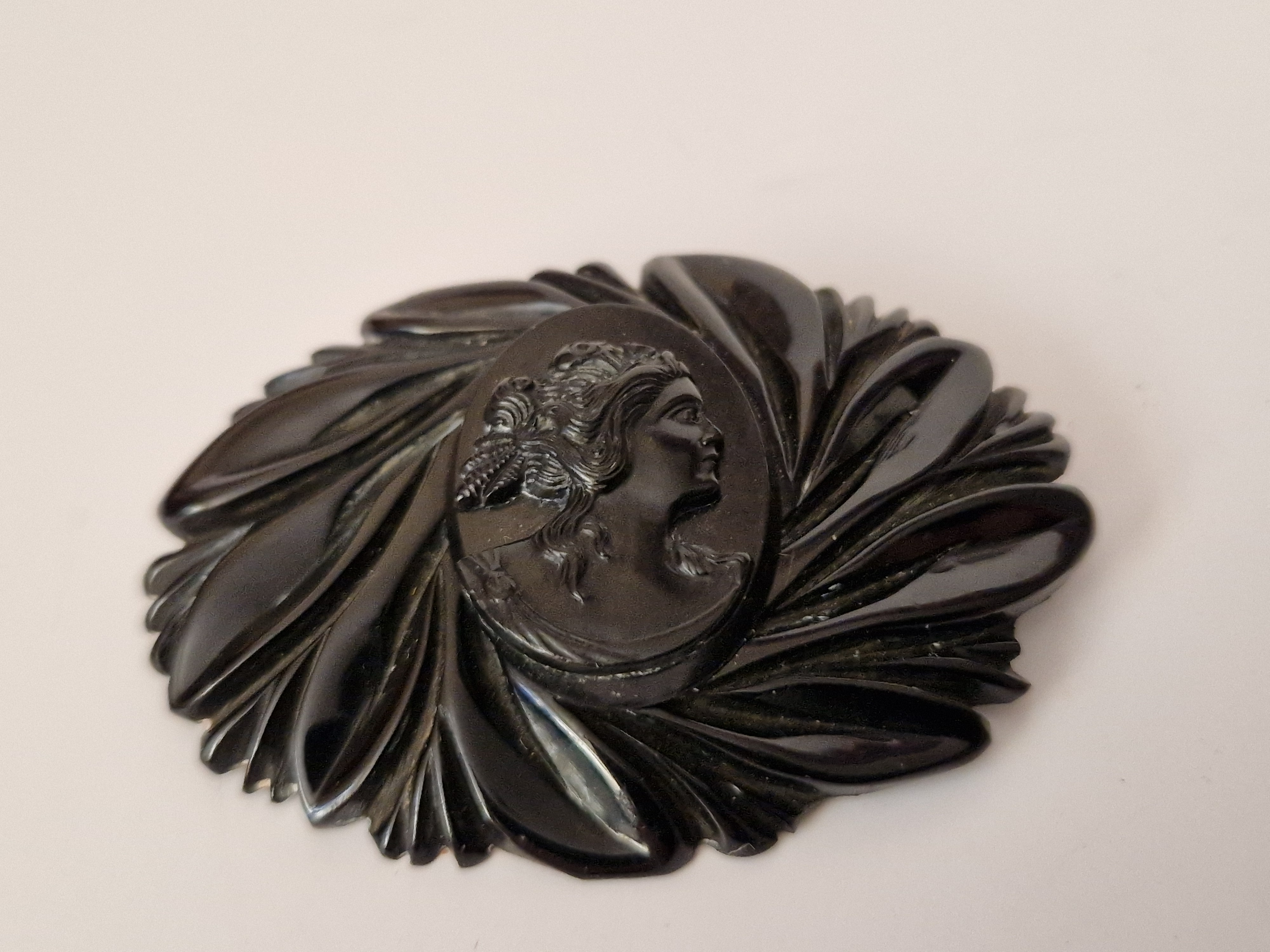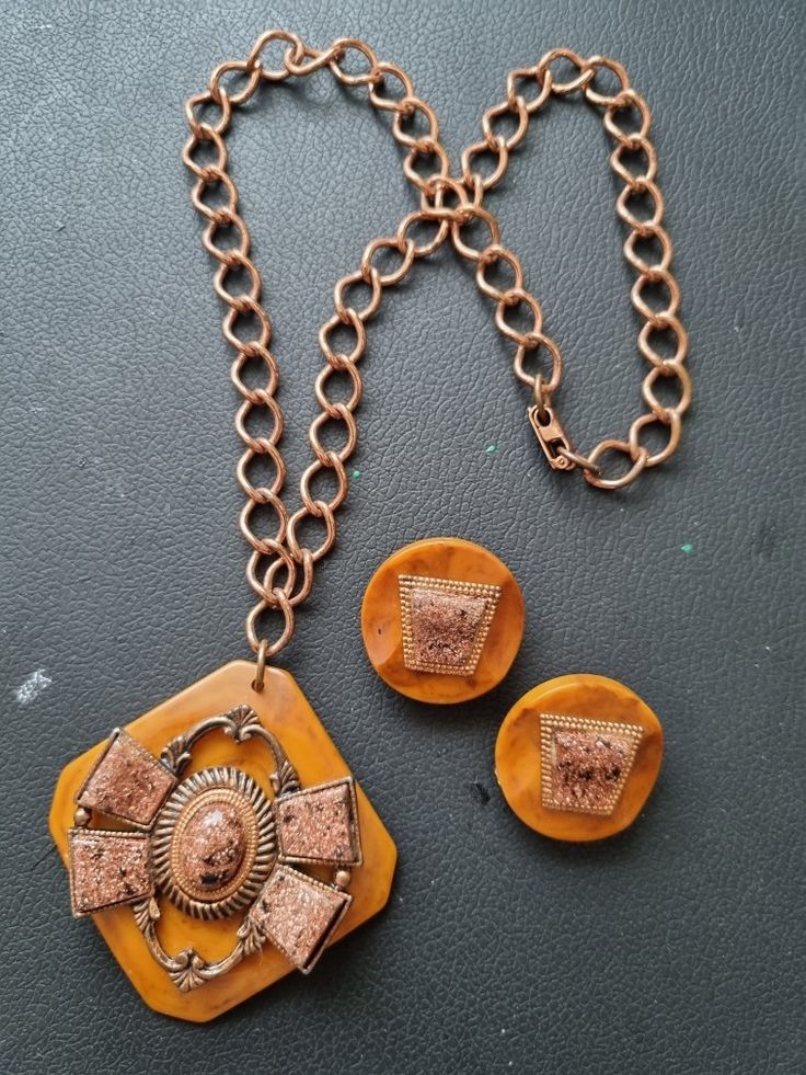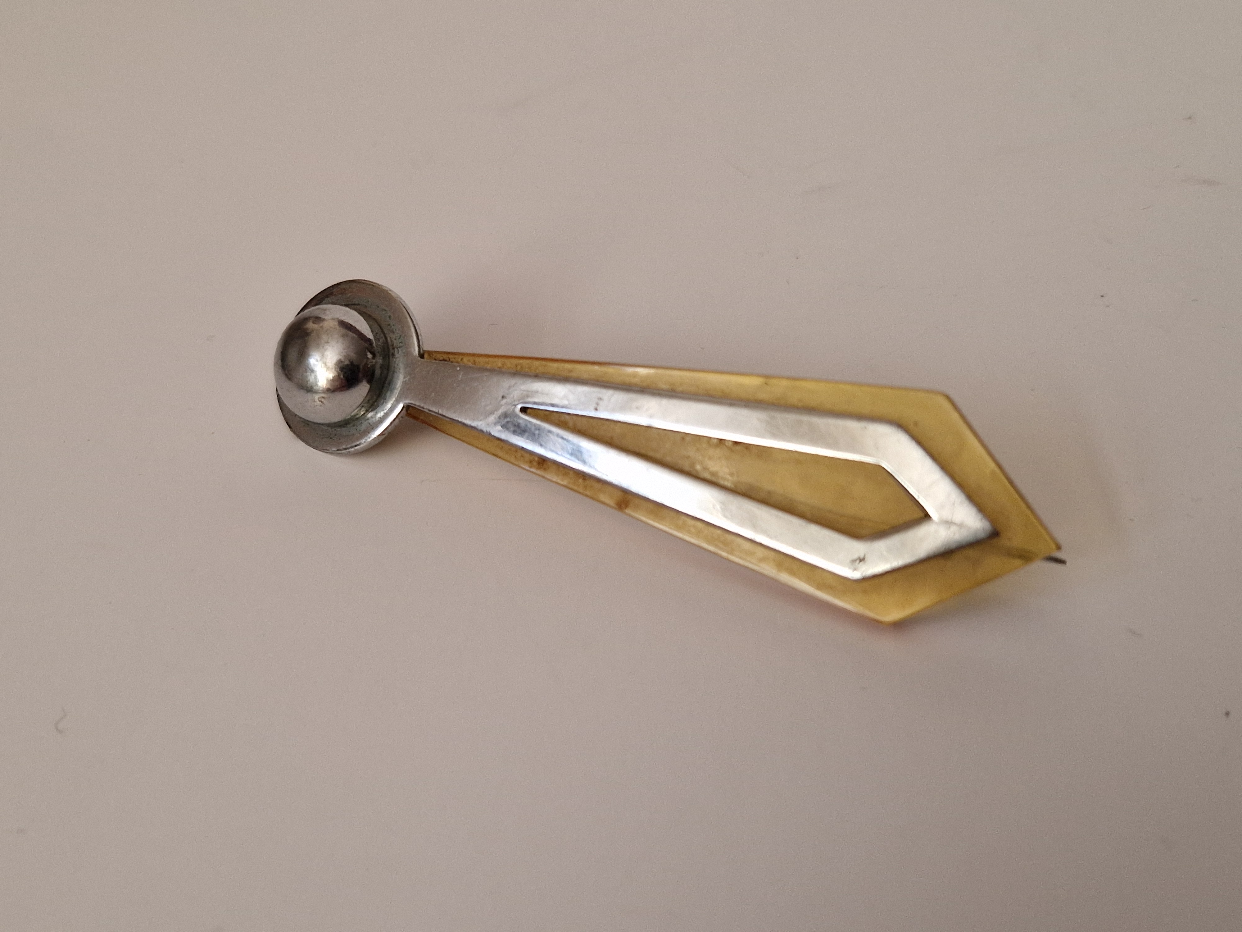 Clips-broscher i bakelit, några med kromdetaljer eller detaljer av mässingsfärgad metall. Tre av dem är sk ”reversed carved”, dvs de är skurna och målade från baksidan för att skapa en 3D-effekt.